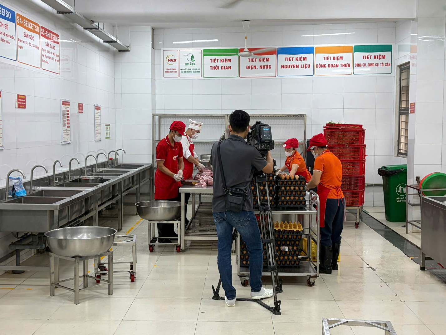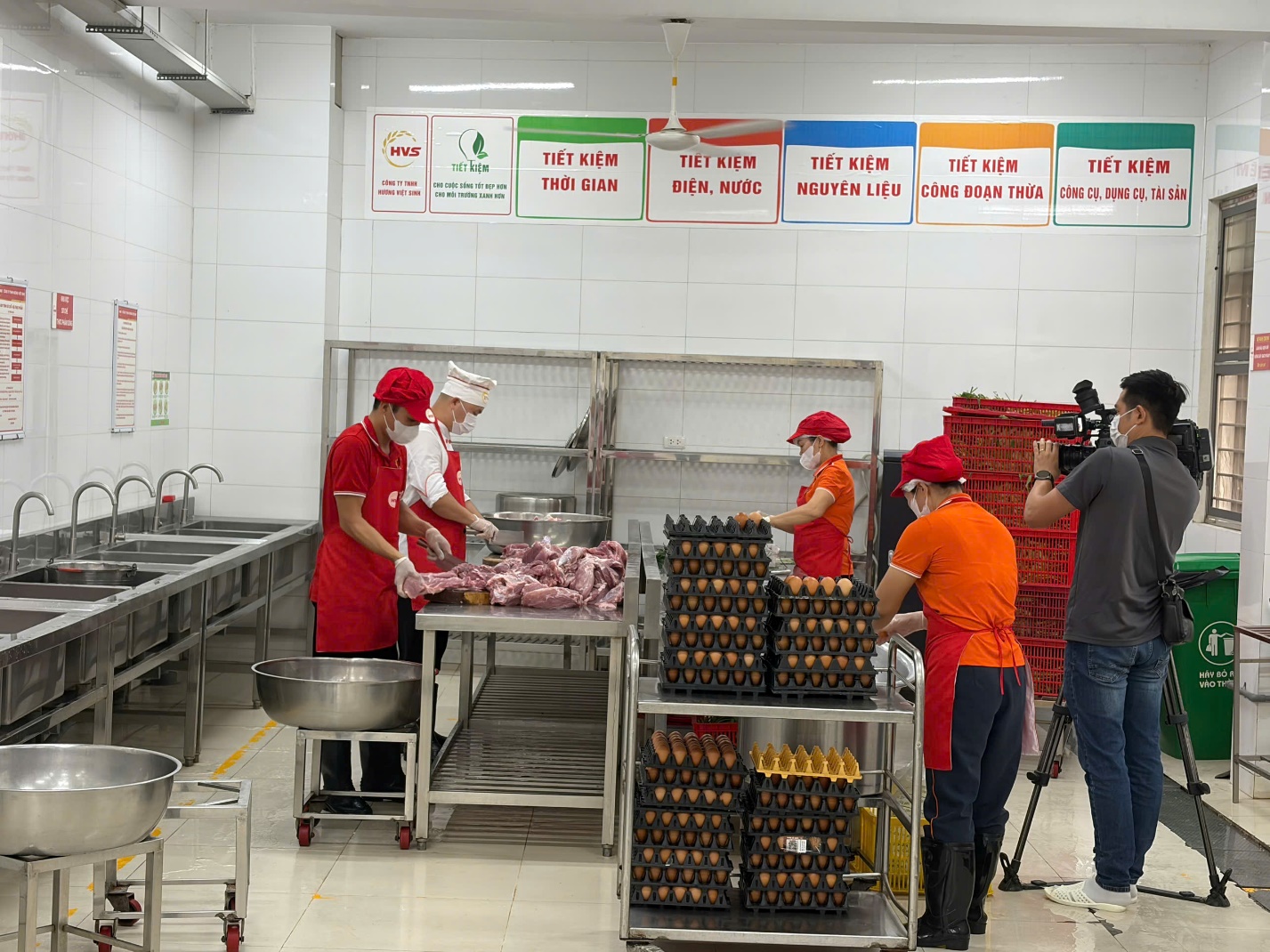 Máy quay truyền hình ghi lại quá trình chế biên thực phẩm của nhà bếp