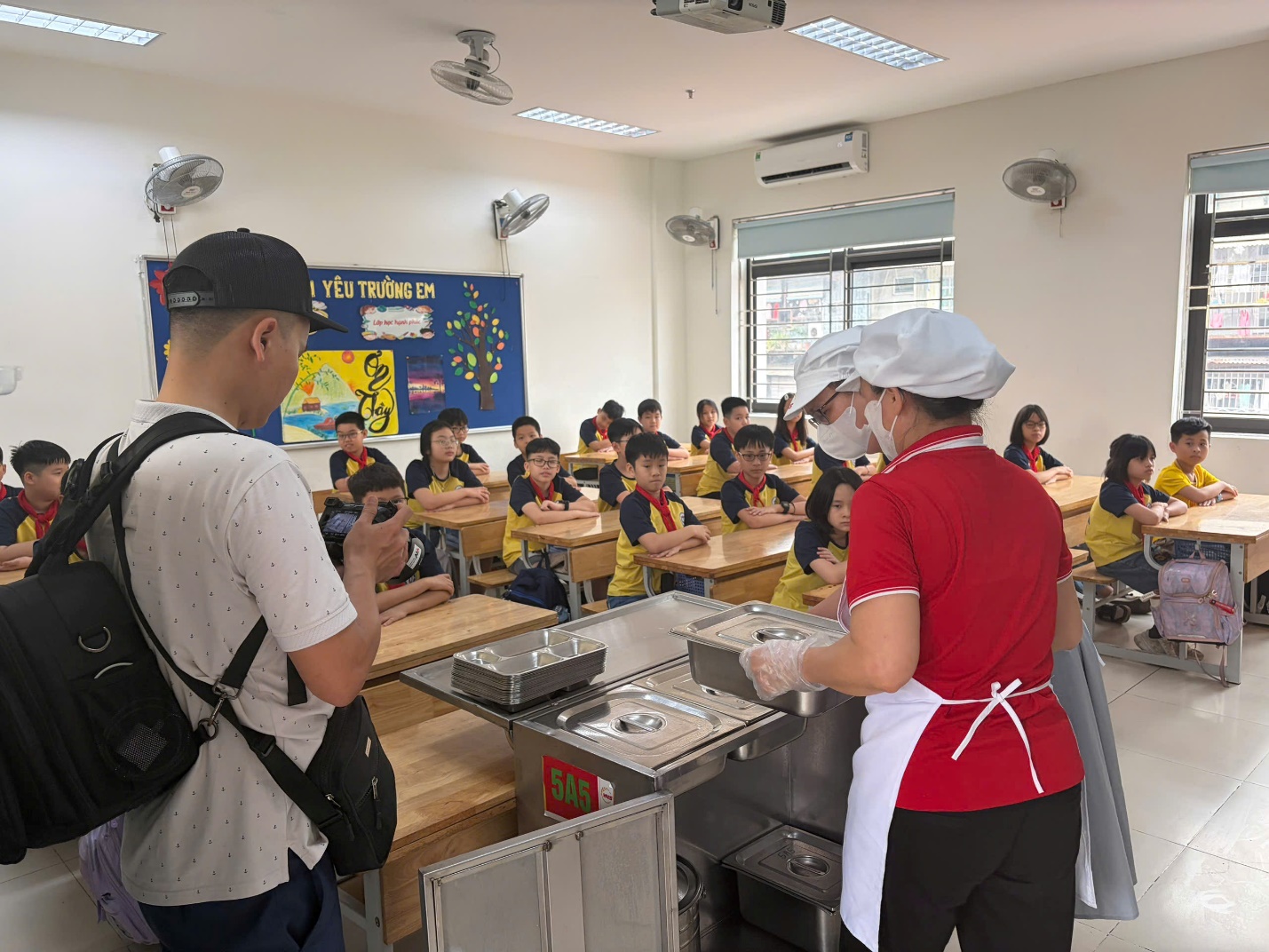 Bộ phận nhà bếp bàn giao xe đồ ăn tới giáo viên