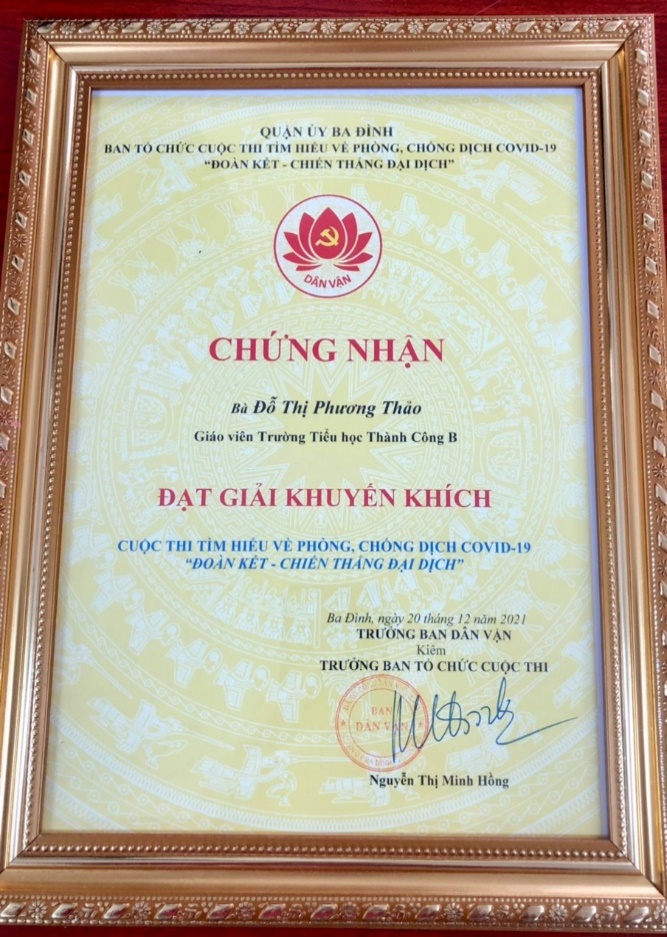 Chúc mừng bài dự thi của cô giáo Đỗ Thị Phương Thảo – giáo viên chủ nhiệm lớp 5A5 trường Tiểu học Thành Công B đã đạt giải Khuyến khích cuộc thi này.