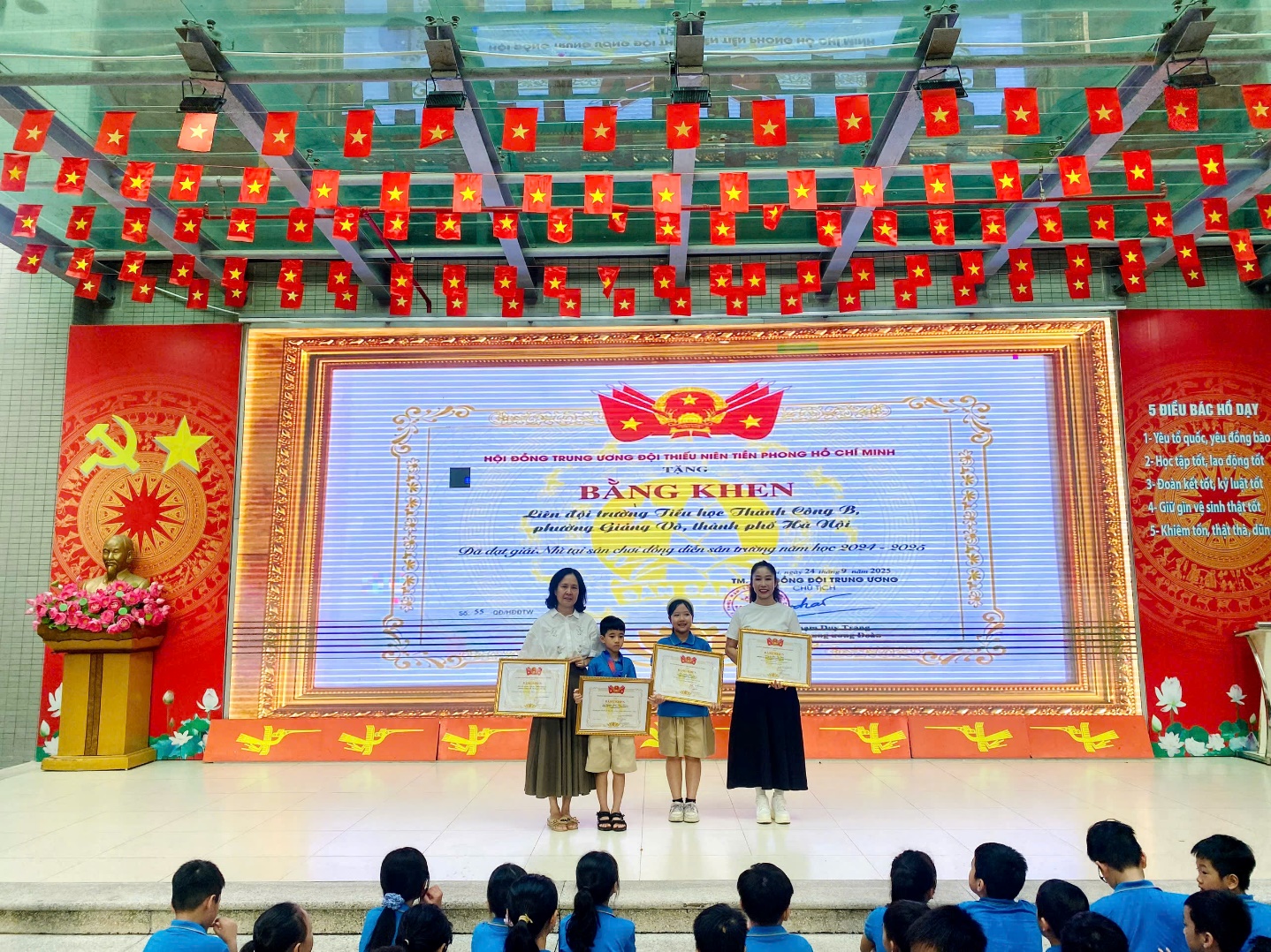 Buổi sinh hoạt cũng trở nên sôi nổi khi Liên đội trường vinh dự được tuyên dương và trao thưởng cho những thành tích nổi bật của học sinh trong năm học 2024–2025. Liên đội Tiểu học Thành Công B đã xuất sắc giành giải Nhì toàn quốc tại sân chơi “Đồng diễn sân trường” do Hội đồng Đội Trung ương và Báo Thiếu niên Tiền phong & Nhi đồng tổ chức. Bên cạnh đó, bạn Nguyễn Đình Phúc Khang (lớp 3A6) đã đạt giải Nhì tại sân chơi “Bảo vệ môi trường” và bạn Dương Nhã An (lớp 3A6) đạt giải Xuất sắc cuộc thi vẽ tranh “ Em vẽ sắc màu quê hương”.