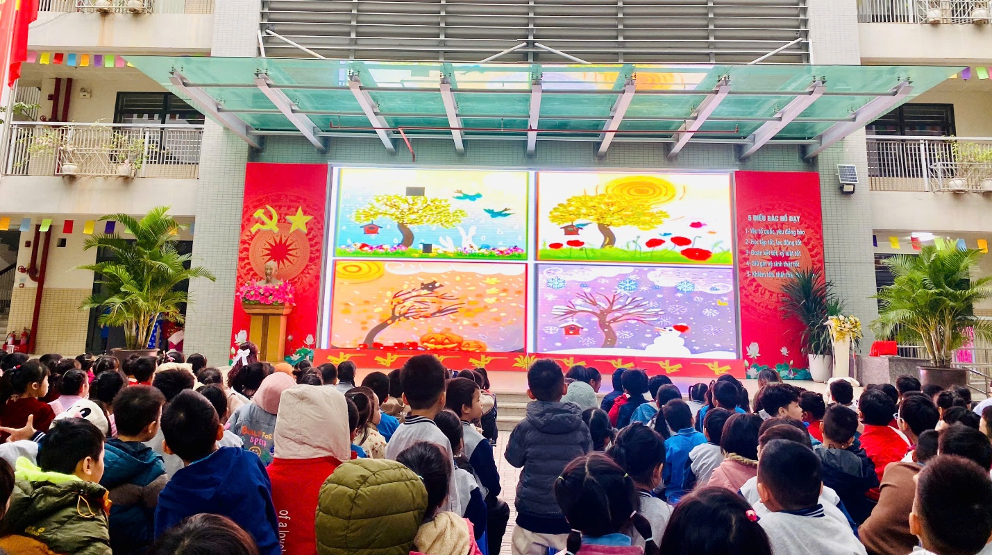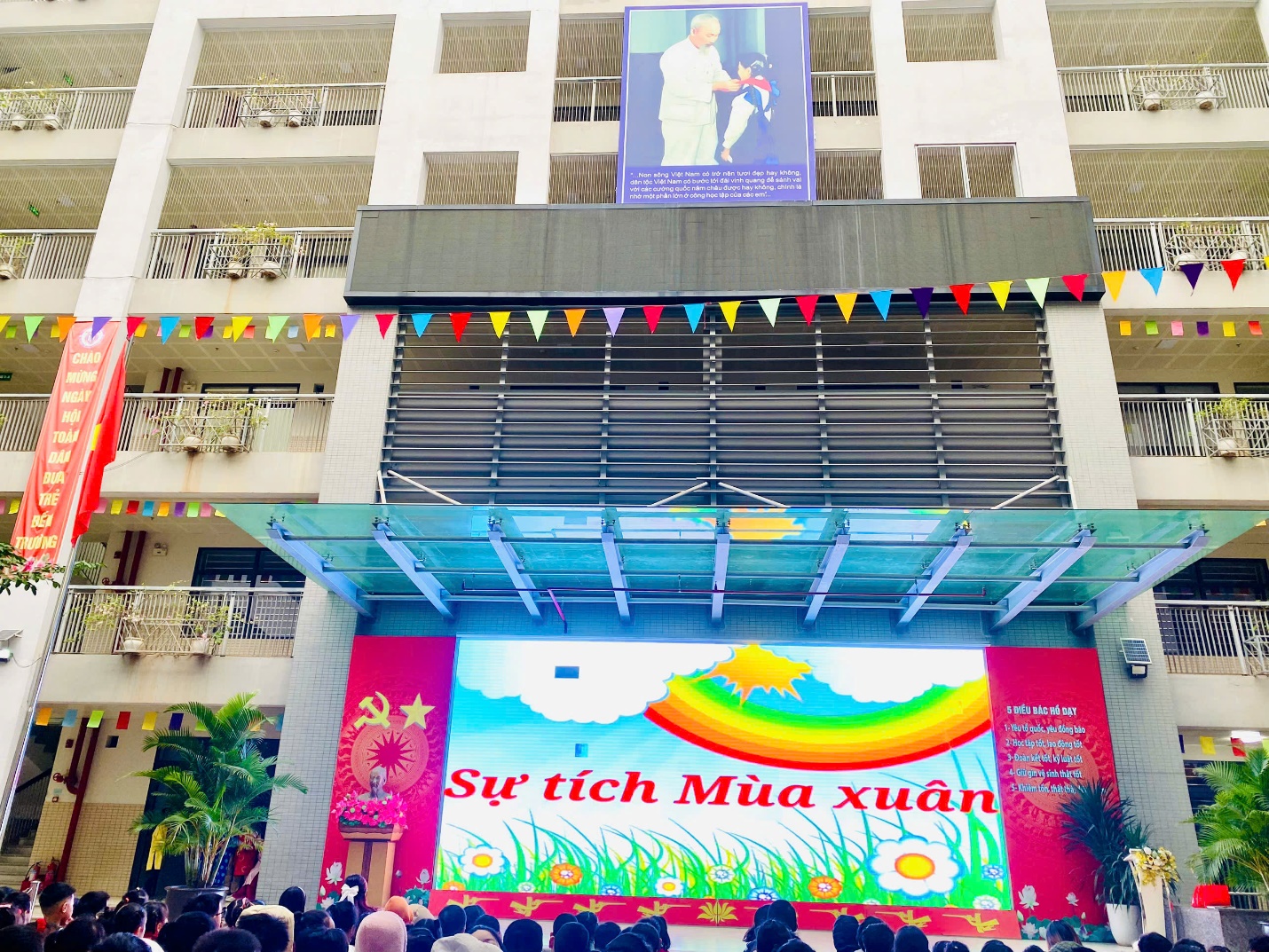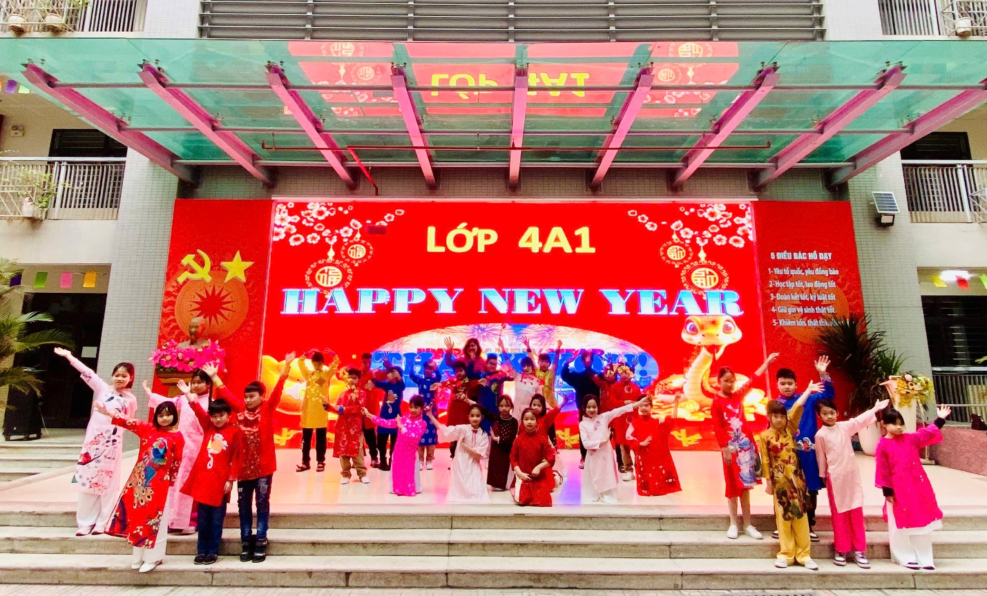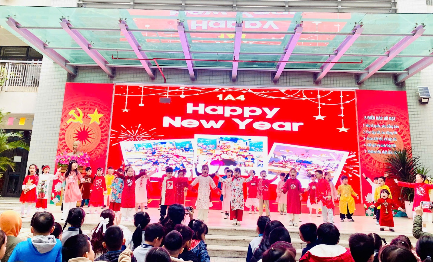 Không chỉ dừng lại ở việc lắng nghe câu chuyện xuân, các em còn được thưởng thức những tiết mục văn nghệ sôi động do các lớp 1A4 và 4A1 biểu diễn. Những điệu múa, bài hát rộn ràng đã tạo nên một không gian tràn đầy năng lượng và sức sống. Các em học sinh nhỏ nhắn, xinh xắn trong trang phục Tết rực rỡ đã thể hiện tài năng, niềm đam mê nghệ thuật qua những màn biểu diễn đáng yêu và đầy tự tin.