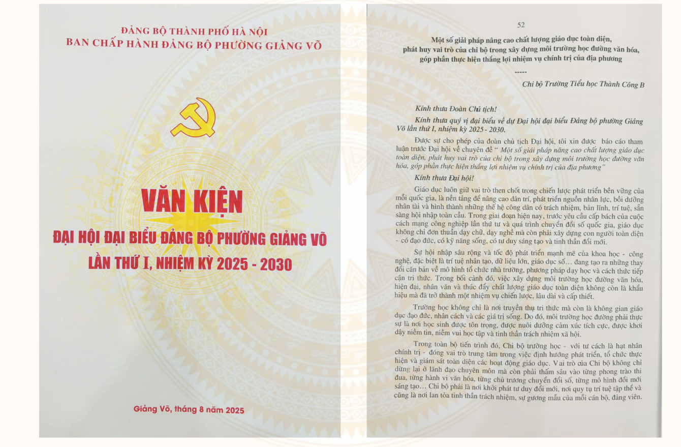 Trong tài liệu văn kiện chính thức của Đại hội, bài tham luận của Chi bộ Trường Tiểu học Thành Công B với chủ đề “Nâng cao chất lượng giáo dục toàn diện, phát huy vai trò của Chi bộ trong xây dựng môi trường học đường văn hóa, góp phần thực hiện thắng lợi nhiệm vụ chính trị của địa phương” đã được đưa vào để các đại biểu nghiên cứu.