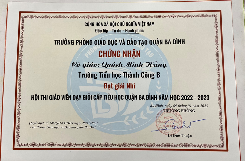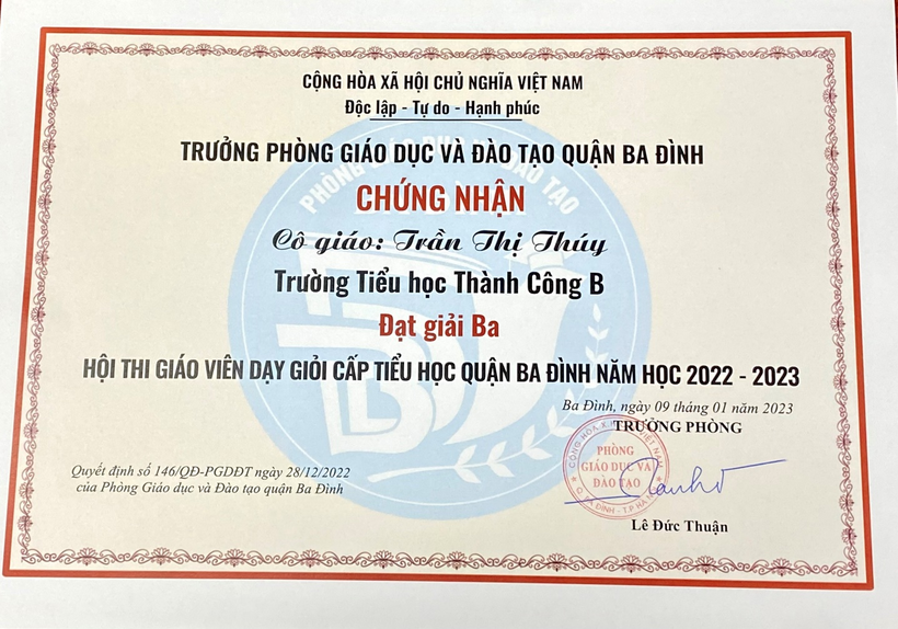 Nhà trường rất vinh dự khi được nhận giấy khen từ PGD quận Ba Đình chứng nhận thành tích đạt được của ba cô giáo tham gia dự thi.