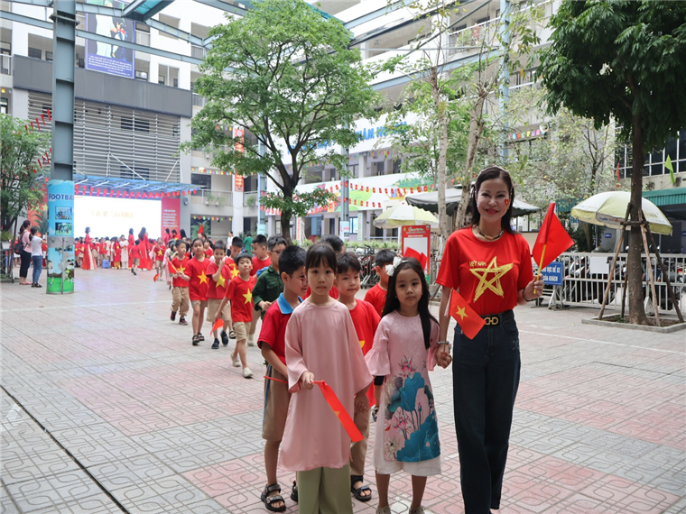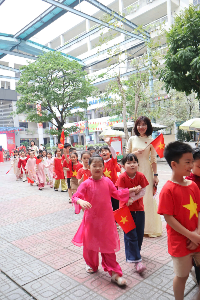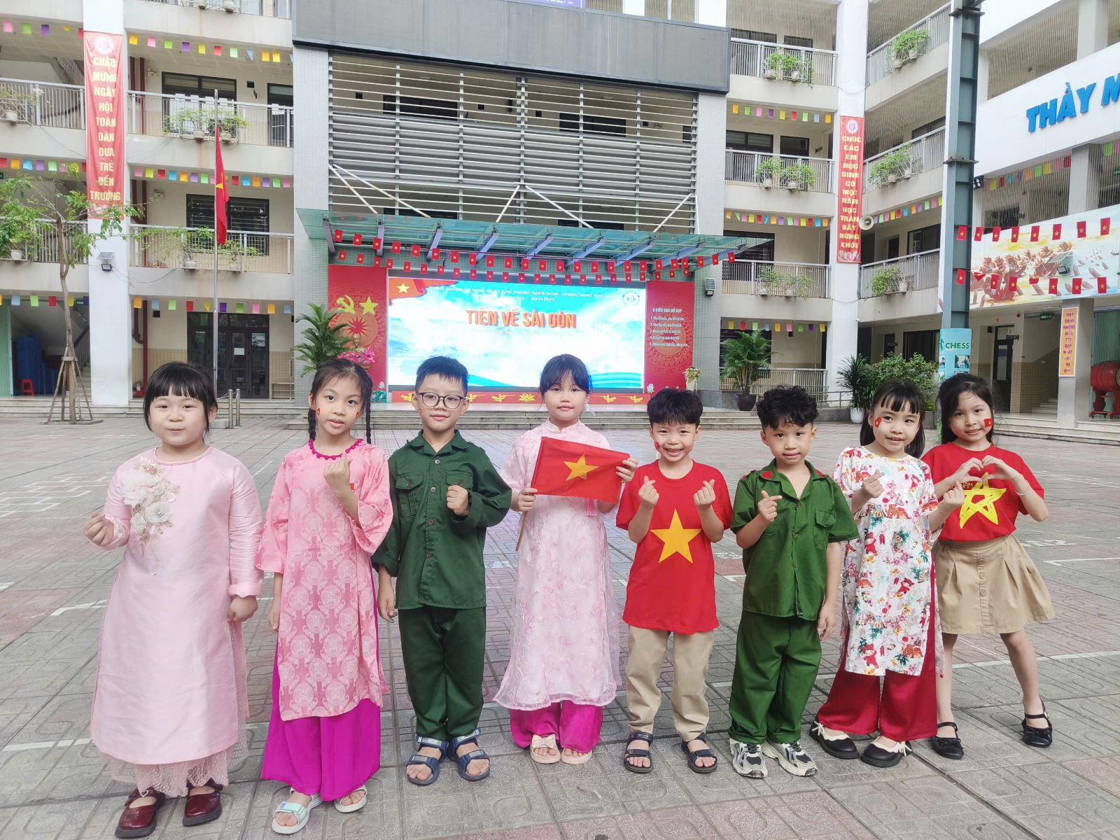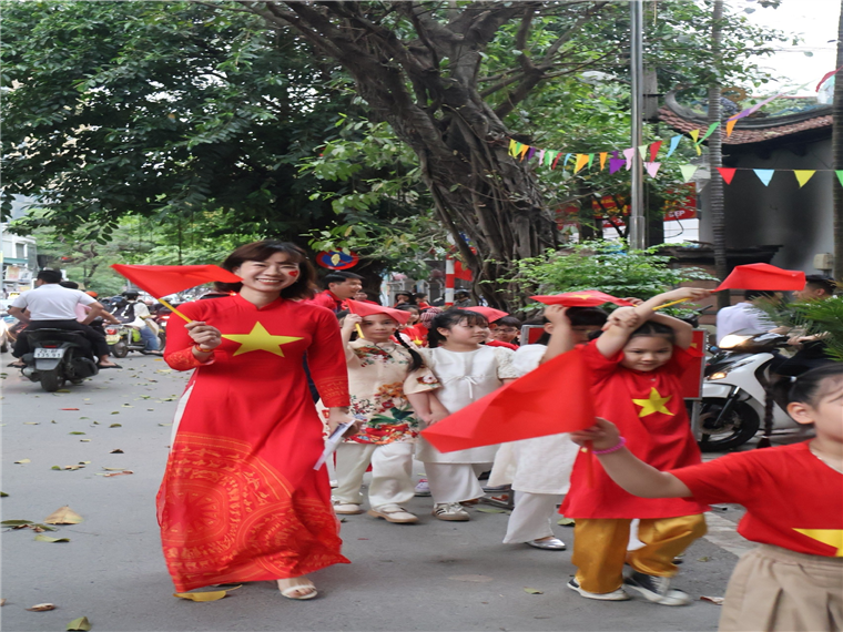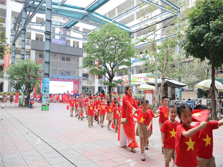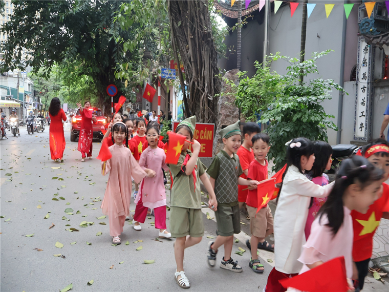 Hình ảnh những “chiến sĩ nhí” trong buổi hành quân thật sự khiến ai đi ngang qua cũng không khỏi dừng lại ngắm nhìn và mỉm cười trìu mến. Các con khoác trên mình những bộ trang phục rực rỡ sắc màu của lòng yêu nước: bé thì mặc áo cờ đỏ sao vàng rực rỡ, có bạn lại duyên dáng trong tà áo dài truyền thống, có em lại hóa thân thành những chú bộ đội nhỏ nhắn với bộ quân phục xanh màu hy vọng, hay khoác lên mình trang phục dân tộc đậm đà bản sắc. Trên tay, các con đeo những chiếc vòng in hình lá cờ Tổ quốc, tay còn lại cầm lá cờ đỏ sao vàng tung bay theo từng nhịp bước, tạo nên một đoàn hành quân vừa nghiêm trang vừa sống động. Đồng hành cùng các con là những cô giáo duyên dáng trong tà áo dài mang hình ảnh lá cờ Tổ quốc – vừa uyển chuyển, vừa rạng ngời tinh thần yêu nước, như những người dẫn đường dịu dàng mà kiên định.