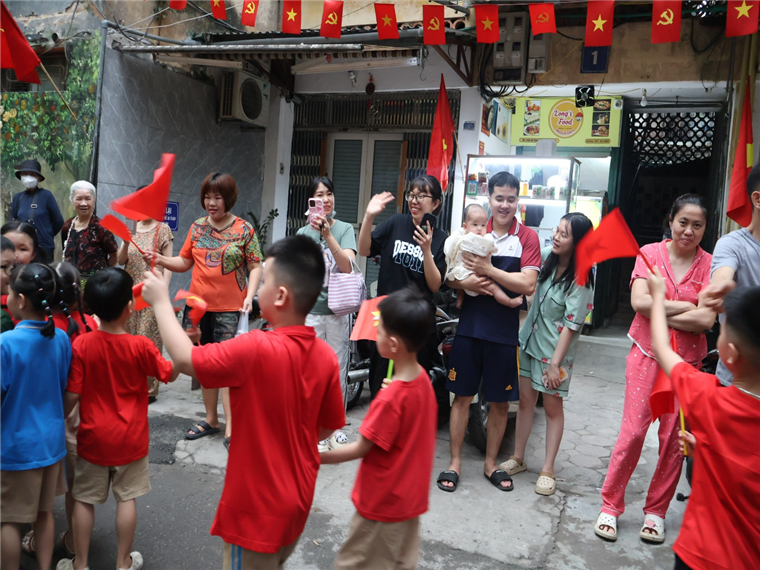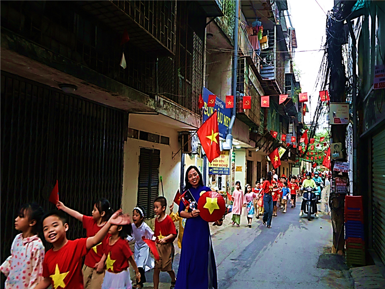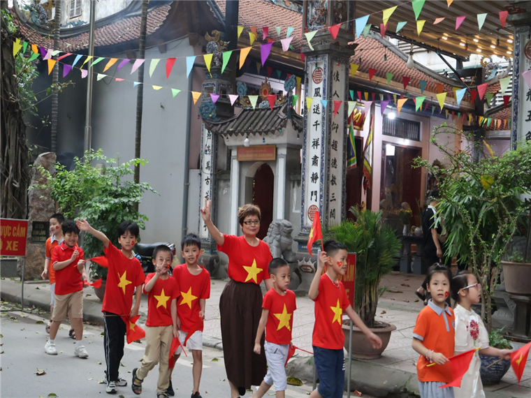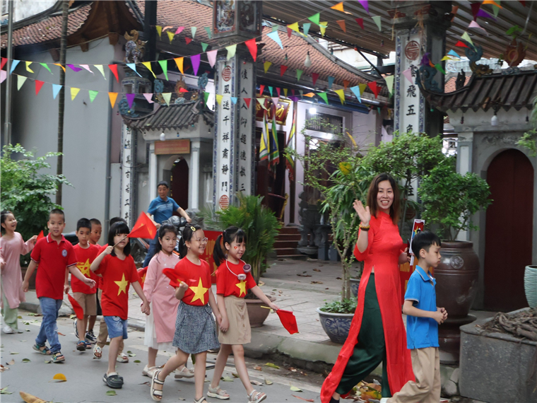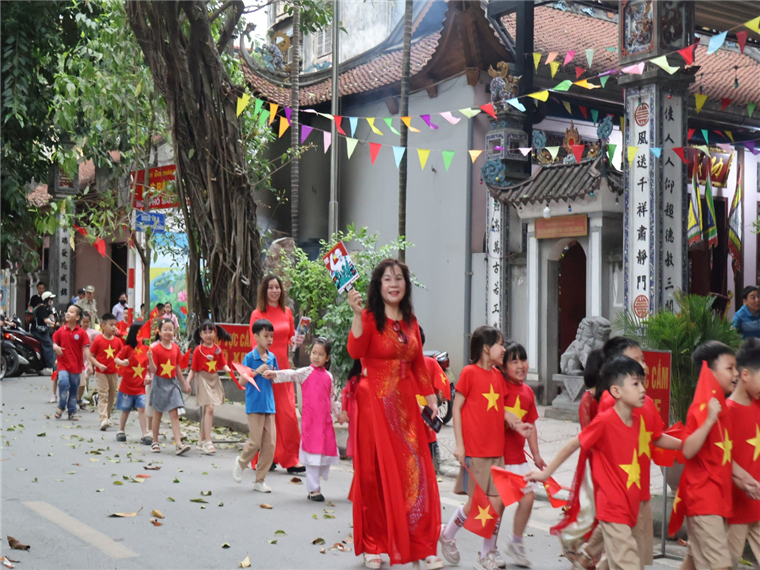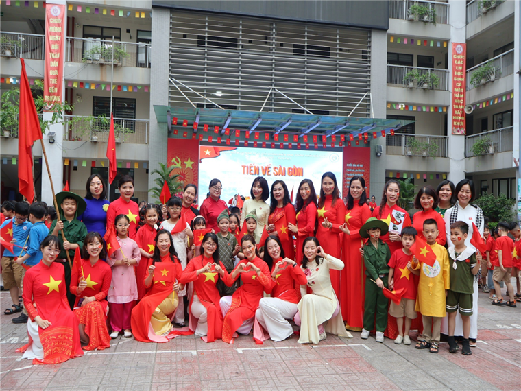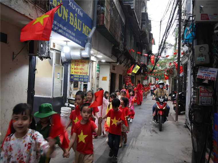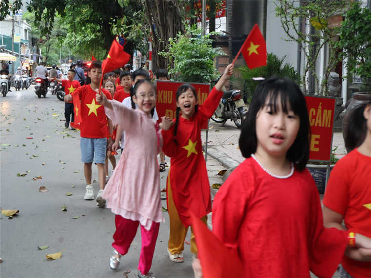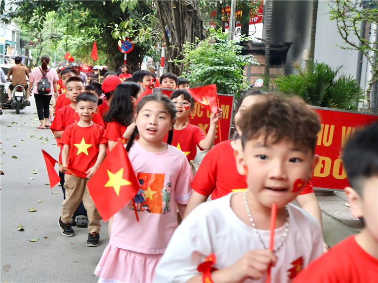 Hình ảnh những “chiến sĩ nhí” trong buổi hành quân thật sự khiến ai đi ngang qua cũng không khỏi dừng lại ngắm nhìn và mỉm cười trìu mến. Các con khoác trên mình những bộ trang phục rực rỡ sắc màu của lòng yêu nước: bé thì mặc áo cờ đỏ sao vàng rực rỡ, có bạn lại duyên dáng trong tà áo dài truyền thống, có em lại hóa thân thành những chú bộ đội nhỏ nhắn với bộ quân phục xanh màu hy vọng, hay khoác lên mình trang phục dân tộc đậm đà bản sắc. Trên tay, các con đeo những chiếc vòng in hình lá cờ Tổ quốc, tay còn lại cầm lá cờ đỏ sao vàng tung bay theo từng nhịp bước, tạo nên một đoàn hành quân vừa nghiêm trang vừa sống động. Đồng hành cùng các con là những cô giáo duyên dáng trong tà áo dài mang hình ảnh lá cờ Tổ quốc – vừa uyển chuyển, vừa rạng ngời tinh thần yêu nước, như những người dẫn đường dịu dàng mà kiên định.