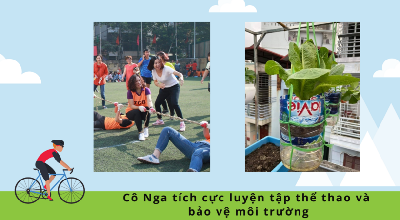 Cô Nga chăm tập luyện thể thao và luôn tràn trề sức sống để làm nhiều việc có ích.