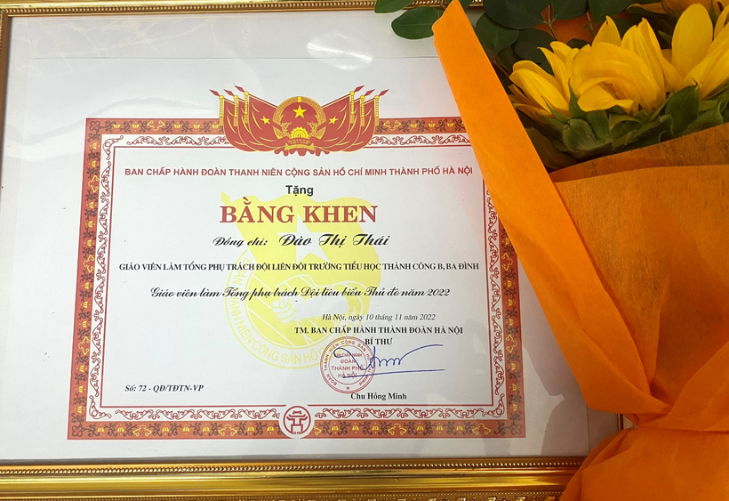 Cô giáo Đào Thị Thái, Tổng phụ trách trường Tiểu học Thành Công B vinh dự được nhận bằng khen của Hội đồng Đội Thành phố Hà Nội vì những đóng góp xuất sắc trong thời gian vừa qua.
