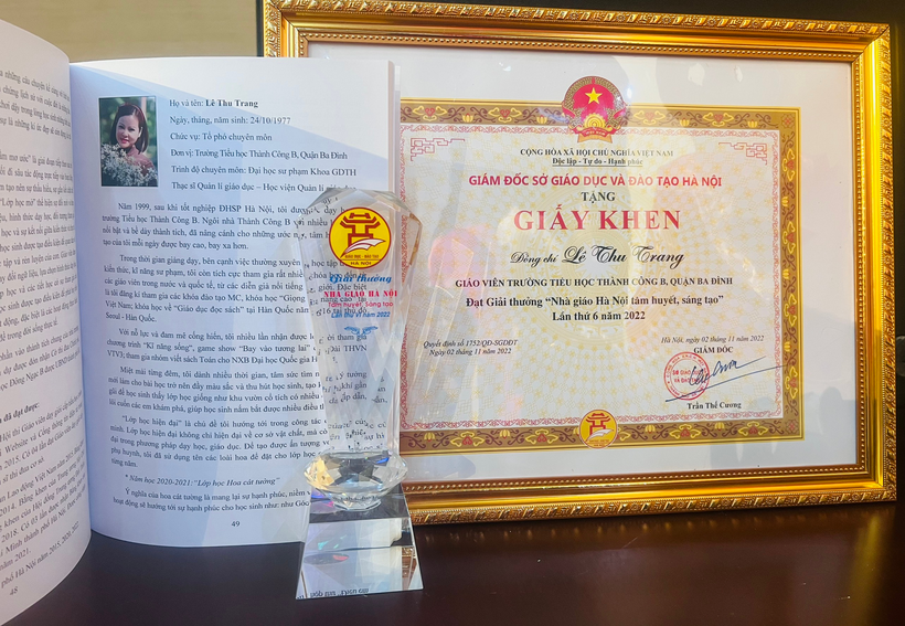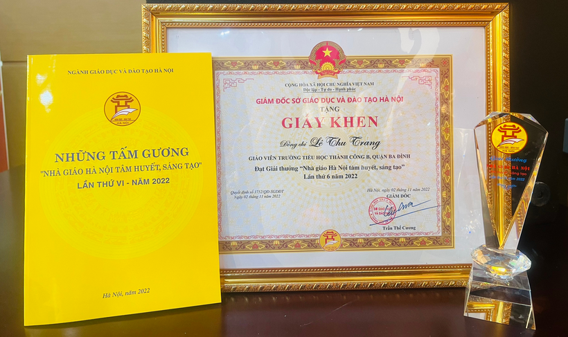 Cô giáo Lê Thu Trang, giáo viên lớp 1 trường tiểu học Thành Công B vinh dự đón nhận Giải thưởng Nhà giáo Hà Nội tâm huyết sáng tạo lần thứ 6. Là một trong số 40 nhà giáo của ngành giáo dục Hà Nội được trao giải của năm học 2022 – 2023, cô Trang đã đem đến cái nhìn mới về Lớp học hiện đại. Đó là lớp học với cơ sở vật chất đầy đủ, phương pháp dạy học tiên tiến. Bên cạnh đó, lớp học phải luôn gần gũi, thân quen và tạo hứng thú cho học sinh thích đến lớp qua cách gọi tên lớp là các loài hoa: hoa Cát Tường, Trạng Nguyên, Bồ Công Anh,… Không chỉ vậy, lớp học hiện đại còn là một Thư viện sống mà mỗi học sinh là một cuốn sách hay. Chính các con sẽ chia sẻ, lan tỏa những bài học hay, tình bạn đẹp, tình yêu gia đình, quê hương đất nước,… qua đó các con được rèn luyện bản thân, tự tin trong giao tiếp, phát triển kĩ năng sống.