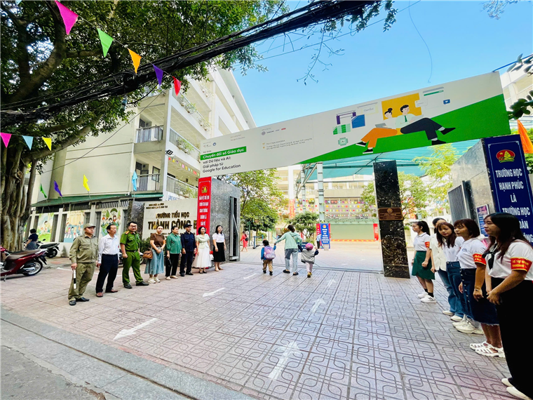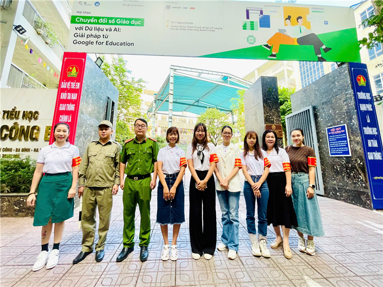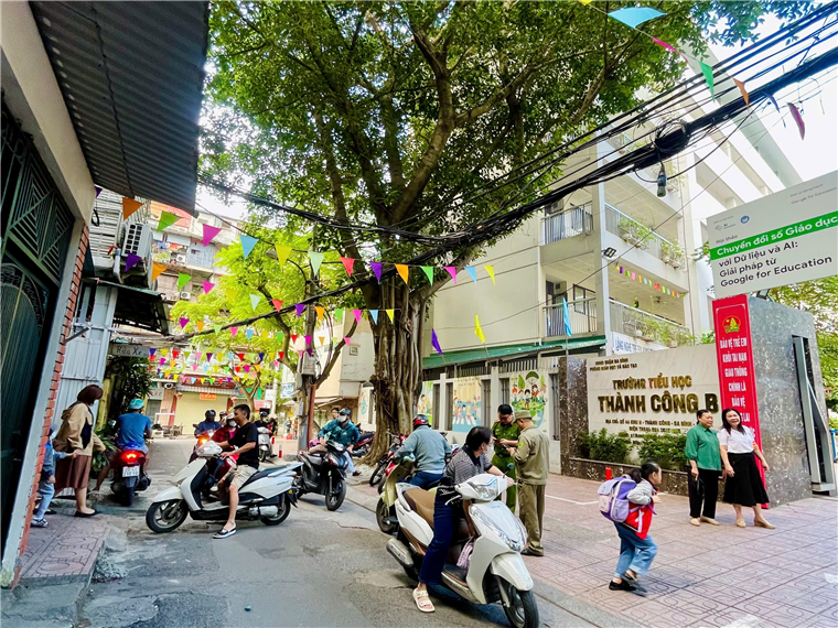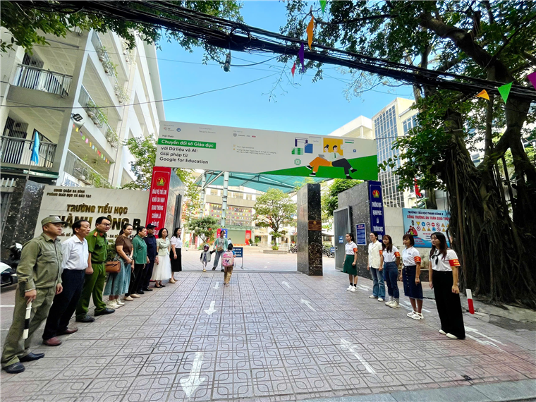 Vào giờ học và tan trường, giáo viên phối hợp với lực lượng Công an phường để tổ chức phân luồng giao thông tại cổng trường. Các giáo viên đã hướng dẫn phụ huynh đỗ xe đúng nơi quy định, tránh tình trạng dừng, đỗ sai quy định gây cản trở giao thông. Đồng thời, các thầy cô cũng nhắc nhở các bậc phụ huynh cũng như các con học sinh đội mũ bảo hiểm và tuân thủ Luật giao thông.