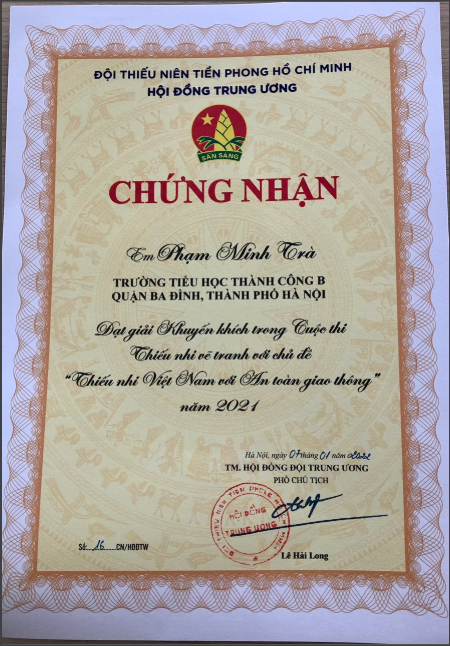 Cuộc thi vẽ: “Hà Nội trong em” chưa kết thúc và Minh Trà cũng là một trong những học sinh có bức vẽ mang sắc màu tươi sáng, nội dung ấn tượng được ban tổ chức đánh giá cao và lọt vào vào chung kết Thành phố Hà Nội.