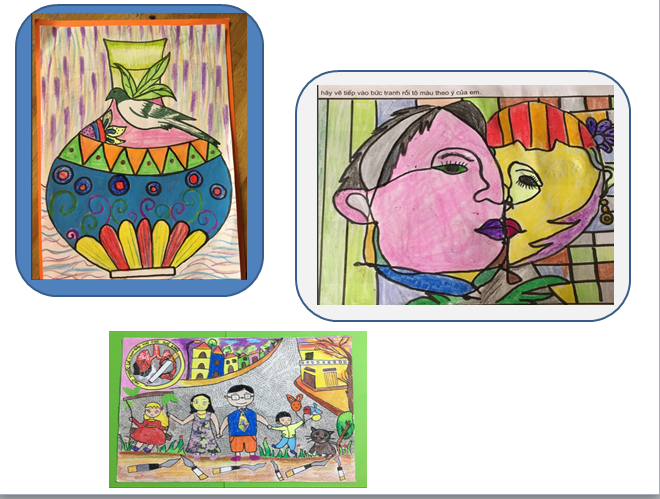 Để có được những bức vẽ có hồn, Minh Trà tập vẽ mọi lúc, mọi nơi. Kể cả những bài vẽ trong vở bài tập Mĩ thuật con cũng chăm chút từng li từng tí.