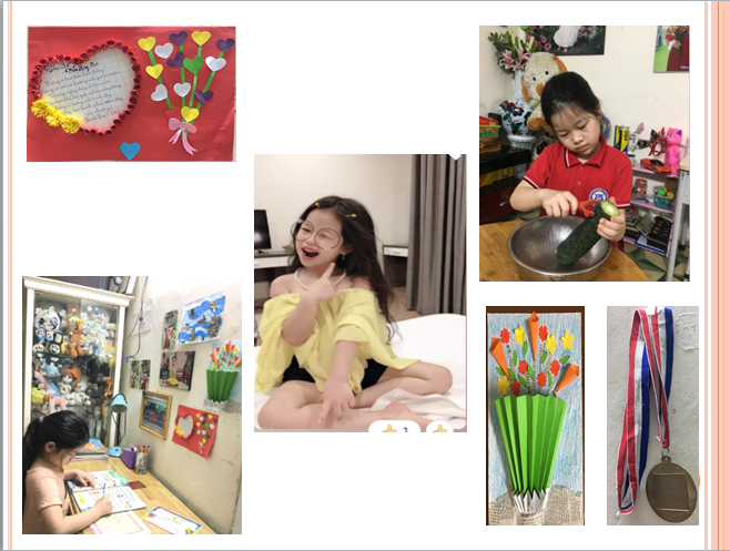 Không chỉ vẽ đẹp, các sản phẩm thủ công của con nom rất đáng yêu. Bất cứ lễ hội nào trong năm con cũng chia sẻ với cô và cả lớp những thứ đồ handmade đầy màu sắc. Vào vai nào con cũng thể hiện tròn trịa. Khi là siêu mẫu nhí đầy cuốn hút, lúc là em bé chăm ngoan giúp mẹ nấu cơm. Nhất là khi ngồi vào bàn học, Minh Trà say mê quên thời gian.