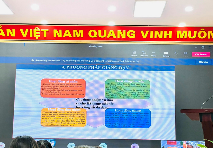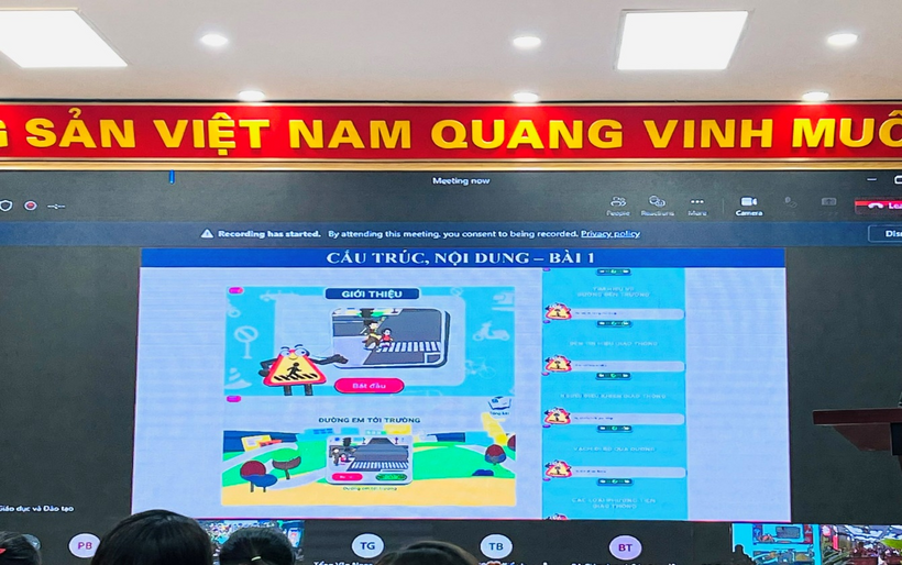 Sau phần khai mạc là phần trình bày của hai báo cáo viên: Cô giáo Vũ Thanh Tâm và Bùi Thị Tú Anh. Hai cô giáo đã nêu bật được tổng quan chương trình, phương pháp dạy học, hướng dẫn tổ chức thực hiện, giới thiệu được những điểm hay của bộ tài liệu giáo dục ATGT dưới dạng học liệu số. Bộ tài liệu là bước đột phá, phù hợp với xu hướng 4.0 và đặc biệt đáp ứng được yêu cầu chuyển đổi số trong giáo dục.