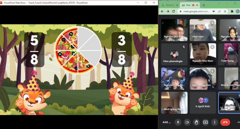 Sau phần giảng bài mới được minh họa bằng sơ đồ đoạn thẳng, học sinh thực hành bài tập 1 qua nội dung “Mở quà giúp bạn hổ”. Học sinh tương tác bằng các điền dấu vào ô chat. Mỗi câu trả lời đúng là mở được một hộp quà. Nội dung bài giảng tiếp theo được khéo léo lồng vào “Lời khuyên của mẹ”. Giáo viên giúp học sinh hiểu và ghi nhớ cách so sánh phân số với 1.