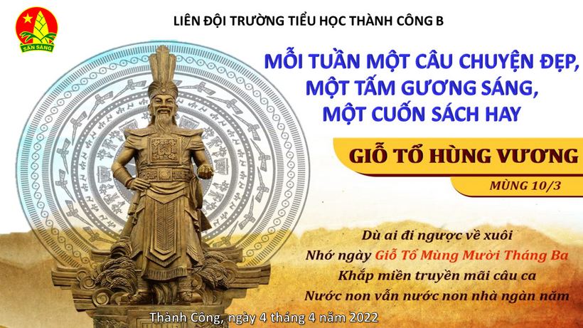 Giỗ Tổ Hùng Vương - Lễ hội Đền Hùng nhằm giáo dục truyền thống yêu nước “Uống nước nhớ nguồn”, biết ơn sâu sắc các Vua Hùng đã có công dựng nước và các bậc tiền nhân kiên cường chống giặc ngoại xâm giữ nước. Trong tuần lễ hướng tới ngày Giỗ tổ Hùng Vương, Liên đội trường Tiểu học Thành Công B đã có những hoạt động ý nghĩa trong chuỗi hoạt động mỗi tuần một câu chuyện đẹp kể về ngày Giỗ tổ 10 - 3.