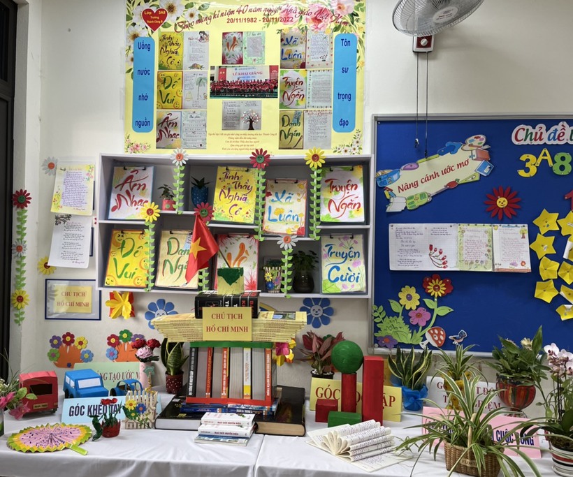 Góc sáng tạo này là nơi chúng con được trưng bày sản phẩm, cùng trao đổi những cuốn sách báo hay và bổ ích- trang bị thêm kiến thức cho chúng con sau những giờ học thú vị. Hôm nay chúng con đã tạm mượn những cuốn sách hay và bổ ích này- sáng tạo, xếp sách hình Lăng Bác để tưởng nhớ công ơn vị cha già kính yêu của dân tộc Việt Nam. Con hi vọng, các hoạt động vui nhộn nho nhỏ của lớp con cũng góp phần tạo nên niềm vui của các thầy cô nhân ngày Nhà giáo Việt Nam 20-11. Chúng con kính chúc thầy cô luôn mạnh khỏe, tiếp tục dìu dắt những búp măng non cập bến bờ tươi sáng.
