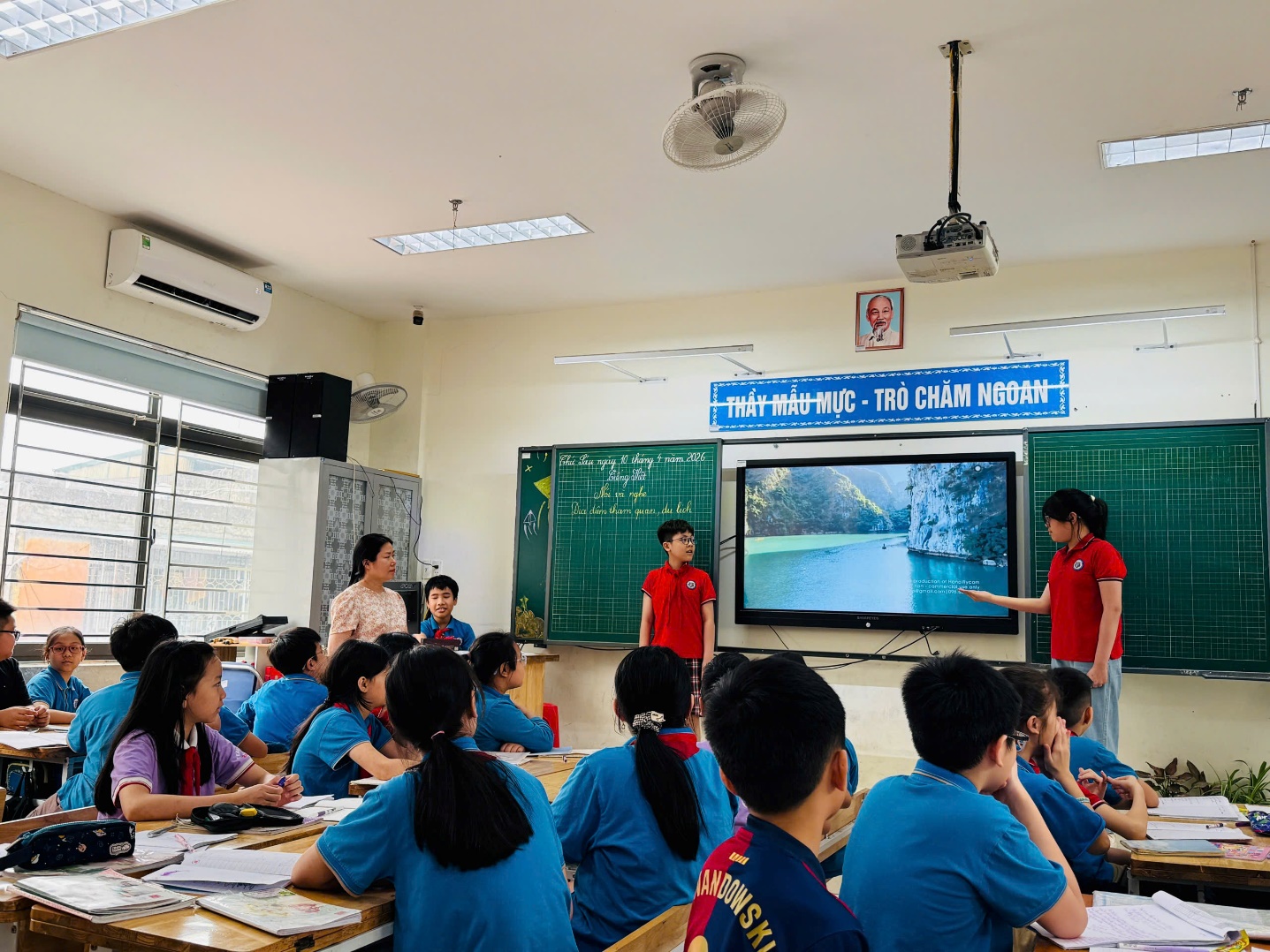 Khép lại tiết học là phần trình bày song ngữ ấn tượng về Vịnh Hạ Long, thể hiện sự tự tin, khả năng chuẩn bị công phu và tinh thần học tập tích cực của học sinh.