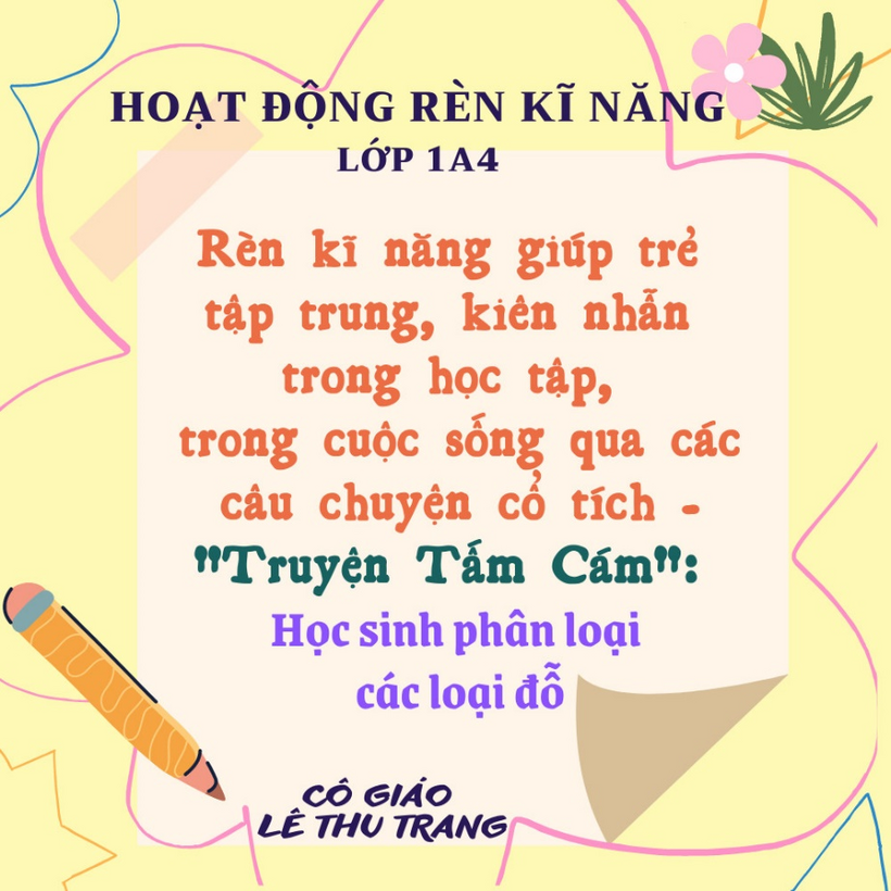 Lấy ý tưởng từ việc dì ghẻ của Tấm trong câu chuyện cổ tích “Tấm Cám” bắt Tấm nhặt riêng thóc, gạo rồi mới cho Tấm đi dự hội. Cô giáo chủ nhiệm lớp 1A4 đã tổ chức cho học sinh tham gia một hoạt động trải nghiệm thú vị, đó là cô giáo trộn lẫn bốn loại hạt đỗ vào một rổ, rồi giao nhiệm vụ cho học sinh nhặt và phân loại riêng bốn loại đỗ đó vào bốn vỏ hộp sữa chua đã qua sử dụng.