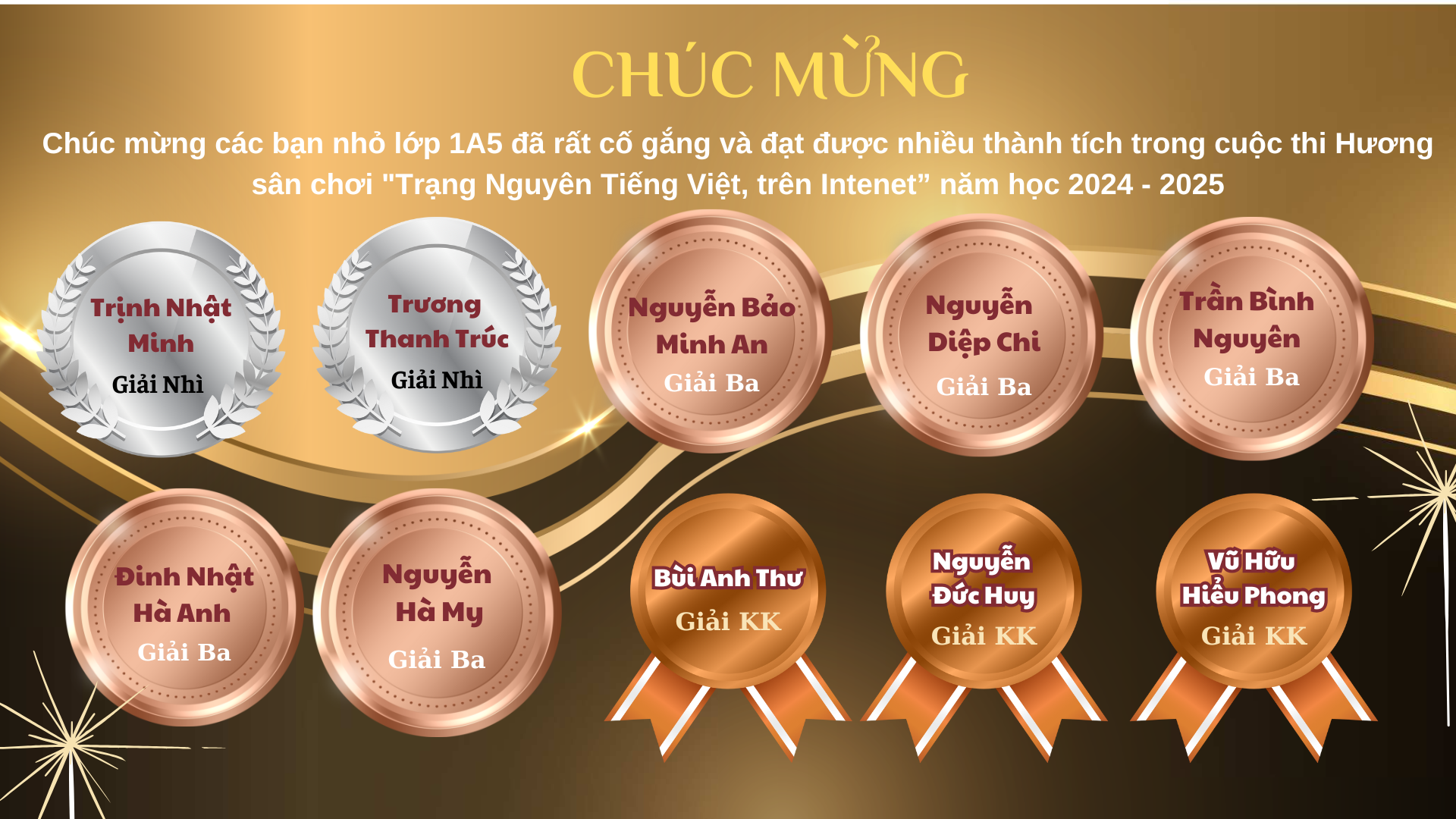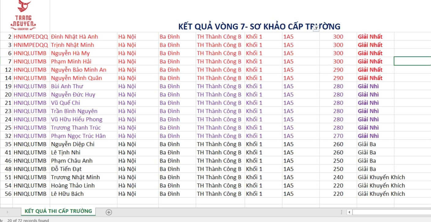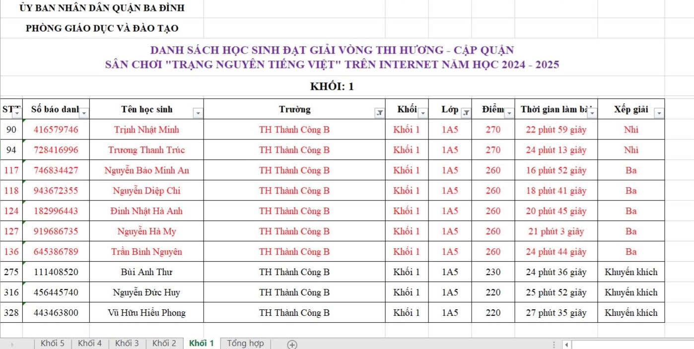 Ngay từ đầu năm học 2024-2025, trường Tiểu học Thành Công B đã phát động tới toàn thể phụ huynh và học sinh quan tâm đến sân chơi này. Cùng với sự động viên, khích lệ của giáo viên chủ nhiệm lớp 1A5, đông đảo phụ huynh học sinh đã tạo điều kiện đăng kí cho con tham gia. Vượt qua các vòng điều kiện, 20 học sinh lớp 1A5 đã được tham gia vòng sơ khảo cấp Trường sân chơi “Trạng Nguyên Tiếng Việt” trên internet năm học 2024-2025 và đạt được nhiều giải cao: