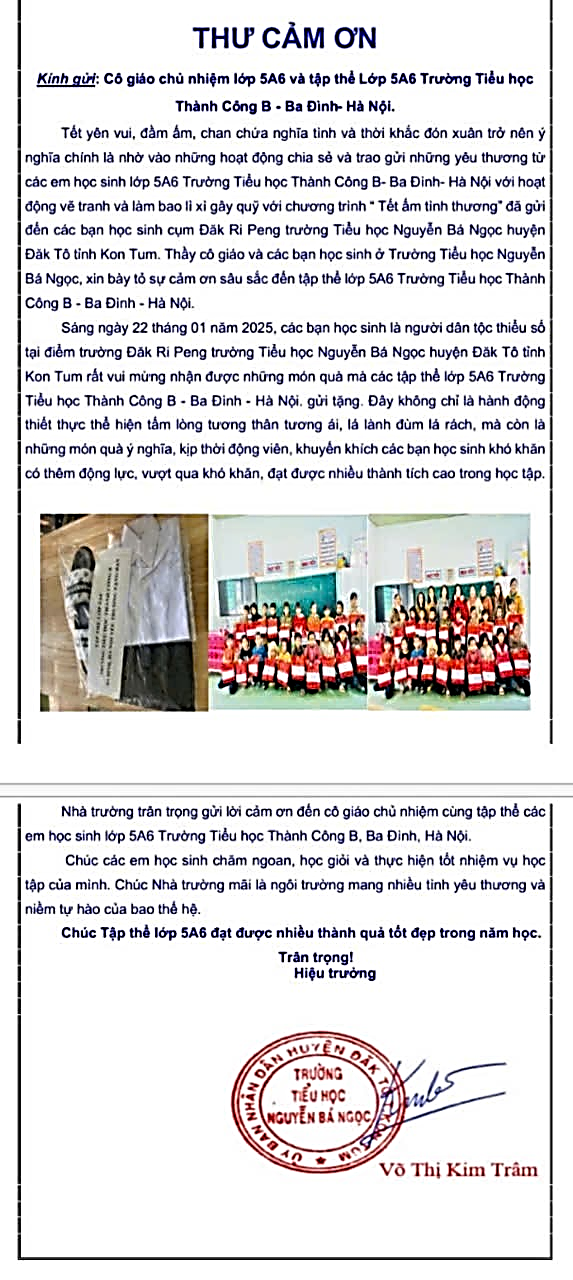 Đặc biệt, ngày 22/01, đại diện Ban Giám hiệu cùng các thầy cô của Trường Tiểu học Nguyễn Bá Ngọc, huyện Đăk Tô, tỉnh Kon Tum đã thay mặt lớp 5A6 trao tận tay những món quà ý nghĩa này, mang niềm vui, hạnh phúc cho các bạn nhỏ nơi đây.