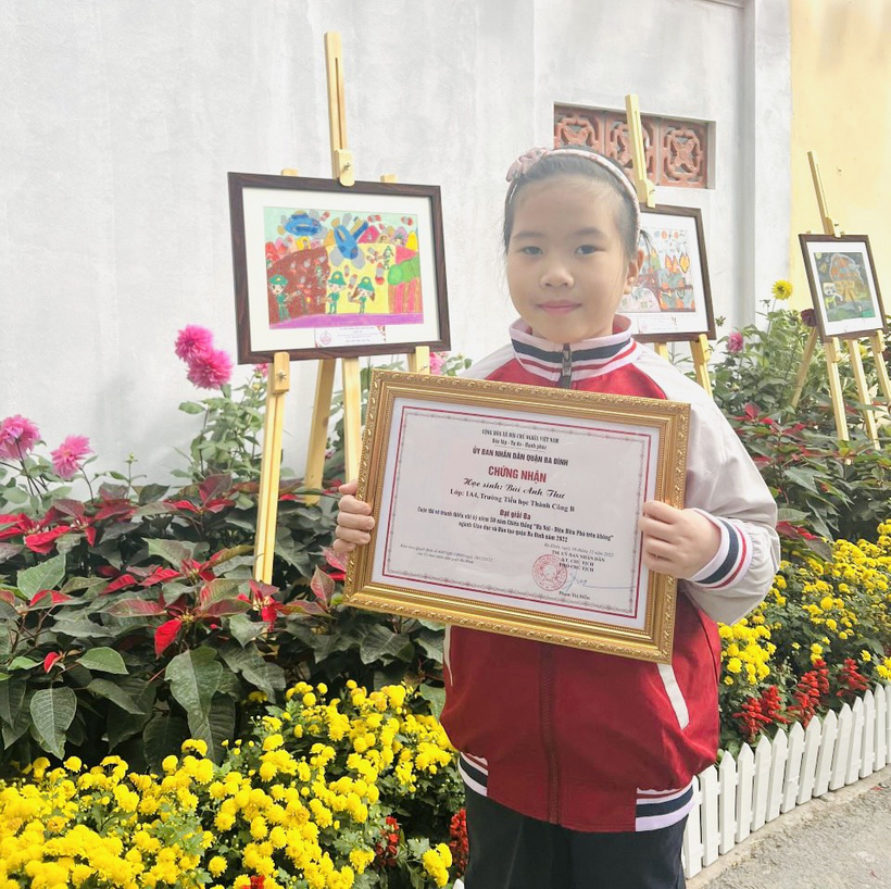 Em Bùi Anh Thư-lớp 1A4 đạt giải Ba cấp quận cuộc thi vẽ tranh với chủ đề “Hà Nội - Điện Biên Phủ trên không”