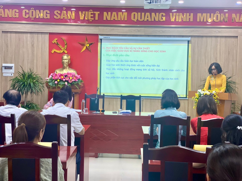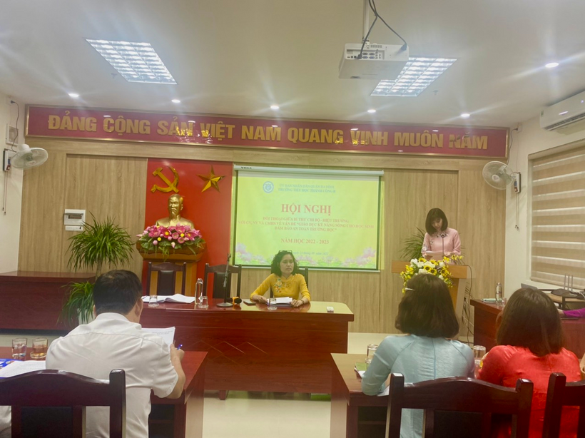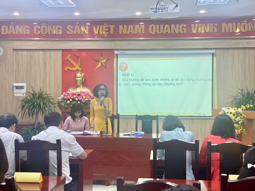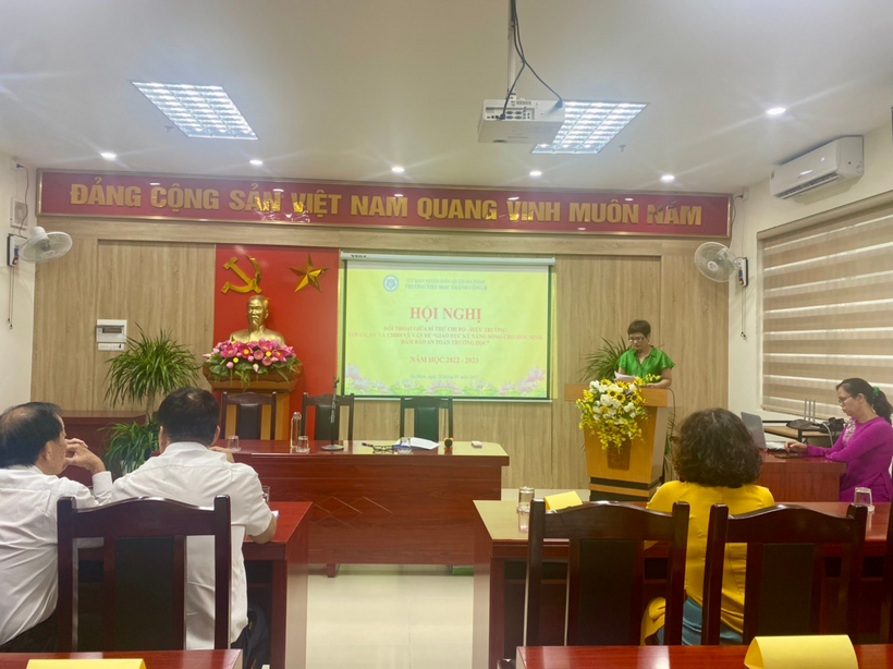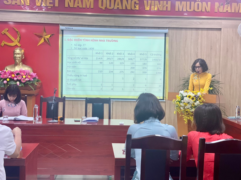 Tại hội nghị, bà Lưu Thị Hồng Hạnh – Bí thư Chi bộ, Hiệu trưởng nhà trường đã báo cáo ngắn gọn đặc điểm tình hình nhà trường, một số kết quả triển khai thực hiện nhiệm vụ quan trọng của nhà trường và cũng là nội dung của buổi đối thoại: Báo cáo kết quả “Giáo dục kĩ năng sống cho học sinh đảm bảo an toàn trường học”.