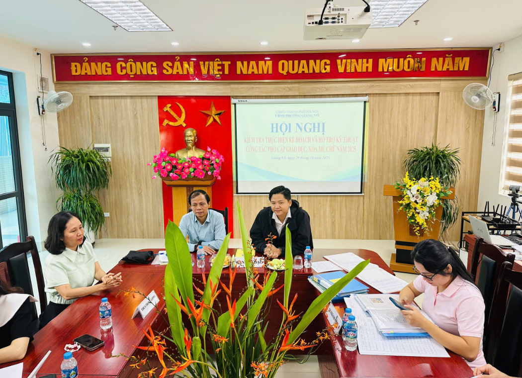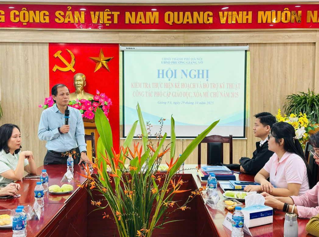 Thực hiện Kế hoạch số 398/KH-SGDĐT ngày 13/02/2025 của Sở Giáo dục và Đào tạo Hà Nội về công tác phổ cập giáo dục mầm non cho trẻ 5 tuổi, phổ cập giáo dục tiểu học, phổ cập giáo dục trung học cơ sở và xóa mù chữ năm 2025, ngày 29/10/2025, Phòng Văn hóa Xã hội (VHXH) UBND phường Giảng Võ đã tổ chức Hội nghị kiểm tra thực hiện kế hoạch và hỗ trợ kỹ thuật công tác phổ cập giáo dục, xóa mù chữ năm 2025 tại Trường Tiểu học Thành Công B.