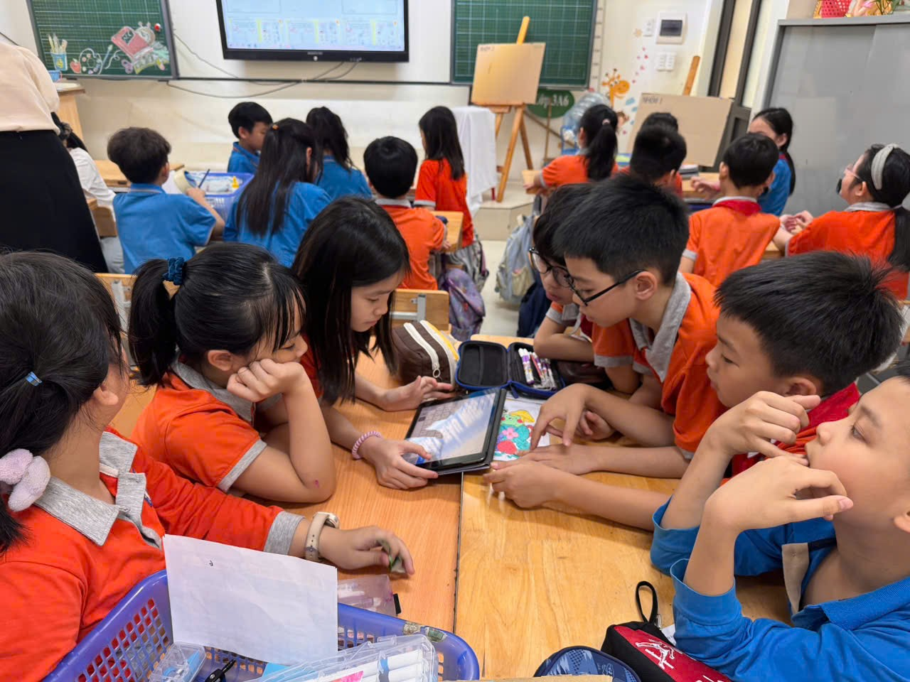 Điểm sáng của tiết học chính là bước Đề xuất giải pháp, nơi công nghệ thông tin được ứng dụng một cách nhịp nhàng. Trước khi bắt tay vào chế tạo, các nhóm đã thực hiện quy trình "đi chợ online" ngay trên iPad. Với phần mềm Classkick, các em tự tay kéo - thả, lựa chọn vật liệu tái chế phù hợp và phác thảo ý tưởng.