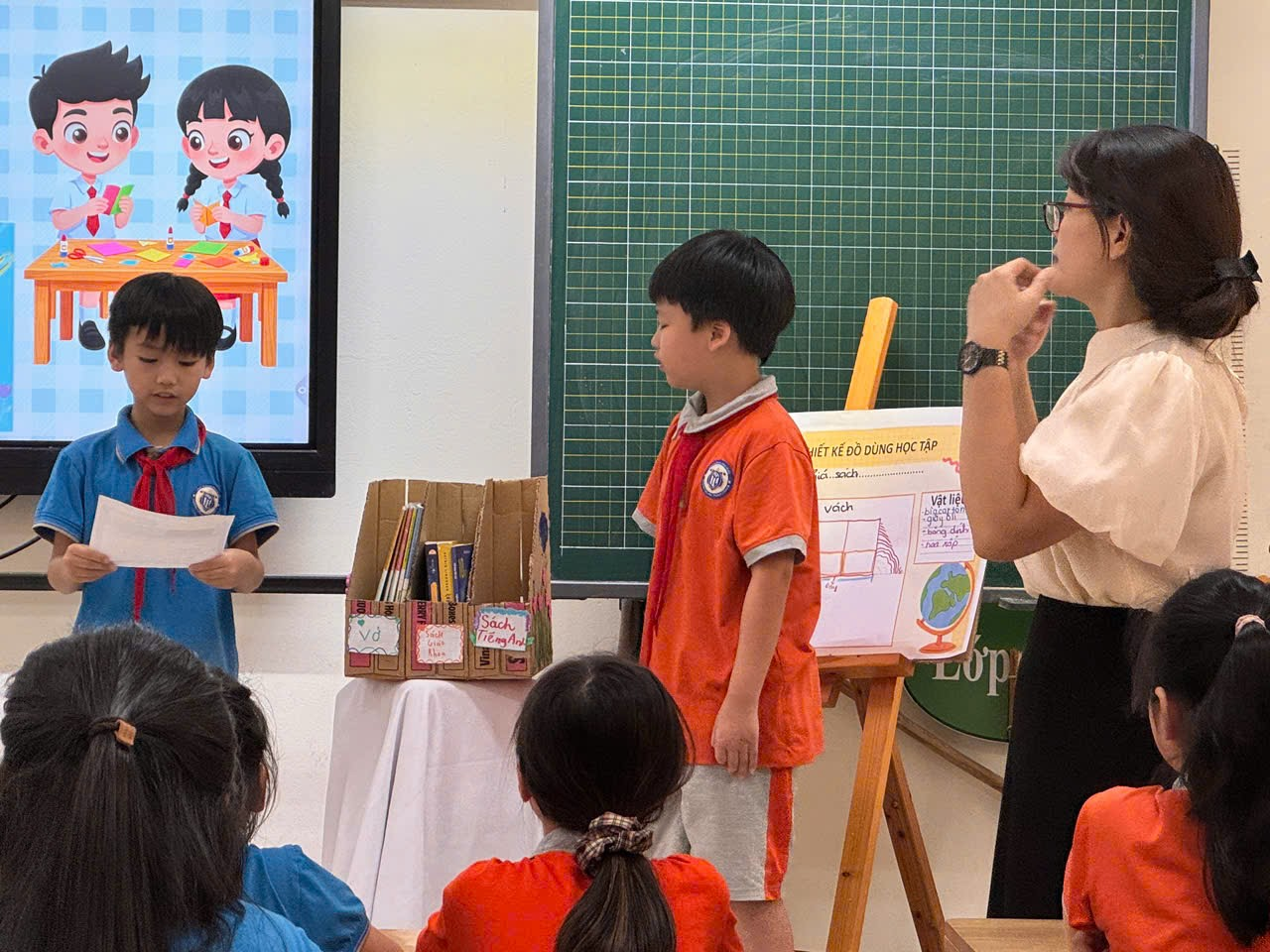 Tiết học bắt đầu trong không gian ngập tràn tiếng cười với trò chơi đoán tên đồ dùng học tập. Sự hào hứng và tự nhiên của trò chơi đã ngay lập tức kích hoạt nguồn năng lượng tích cực của lớp học, giúp các em học sinh sẵn sàng chia sẻ về những món đồ dùng học tập hàng ngày của mình.