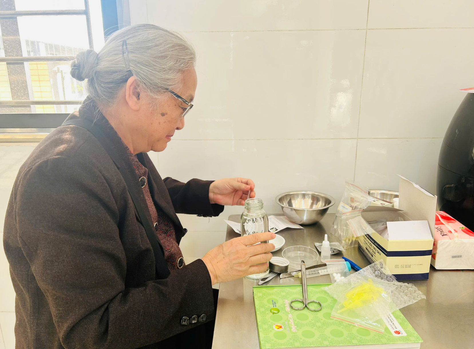 Hình ảnh bà cần mẫn thực hiện kiểm tra mẫu thực phẩm tại bếp ăn.