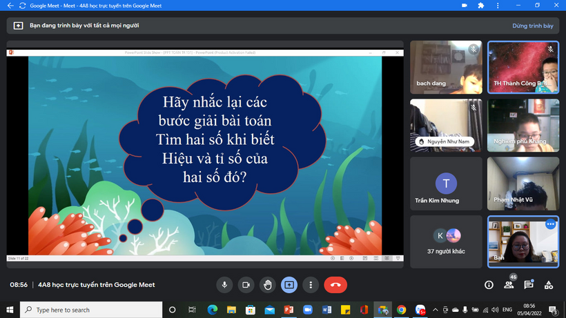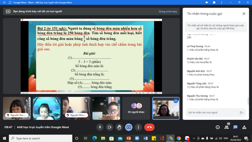 Hình 1: Sinh viên thực tập Đặng Mai Trâm thực hiện giảng dạy tiết Toán Luyện tập ở lớp 4A8 và học sinh tương tác qua phần chat.