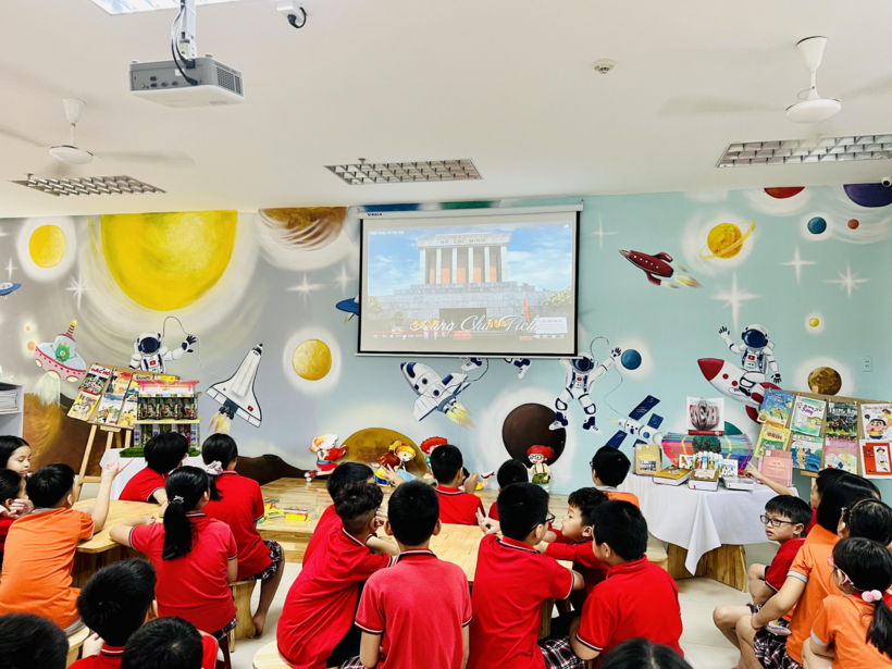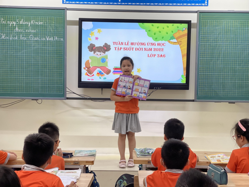 Trong các tiết thư viện, bên cạnh việc các con HS được tự lựa chọn cuốn sách mình yêu thích để đọc, nhân viện thư viện còn khuyến khích các con cùng nhau chia sẻ về cuốn sách đã từng đọc, viết lại tên cuốn sách và nội dung truyện yêu thích lên tấm bảng chung của thư viện. Các con HS khối 4, 5 có thể tham gia sân chơi Book Review bằng cách thuyết trình trên ứng dụng Powerpoint được tổ chức xuyên suốt cả năm học.
