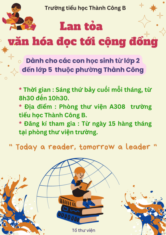 Nhận thấy nhu cầu đọc sách của các con HS là rất lớn, mỗi tuần chỉ có một tiết đến với thư viện và với mục đích lan tỏa tri thức, lan tỏa văn hóa đọc tới cộng đồng. Được sự đồng ý của Ban giám hiệu nhà trường, Thư viện đã có kế hoạch mở cửa vào ngày thứ bảy cuối mỗi tháng dành cho các con HS trong địa bàn phường Thành Công đến đọc sách tại thư viện nhà trường. Hy vọng thông qua việc làm này sẽ mang tới thêm một hoạt động bổ ích, góp phần lan tỏa hơn nữa tình yêu với sách và nâng cao nhu cầu tìm hiểu, nâng cao tri thức trong cộng đồng.