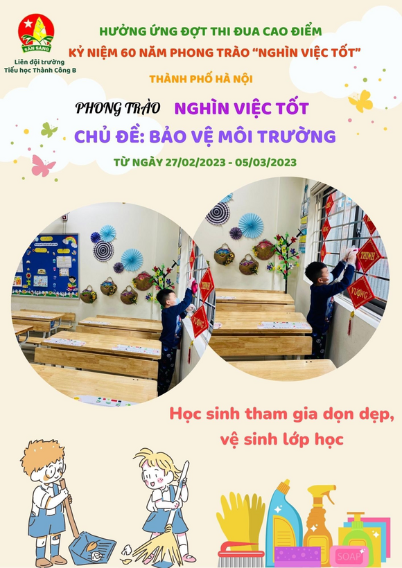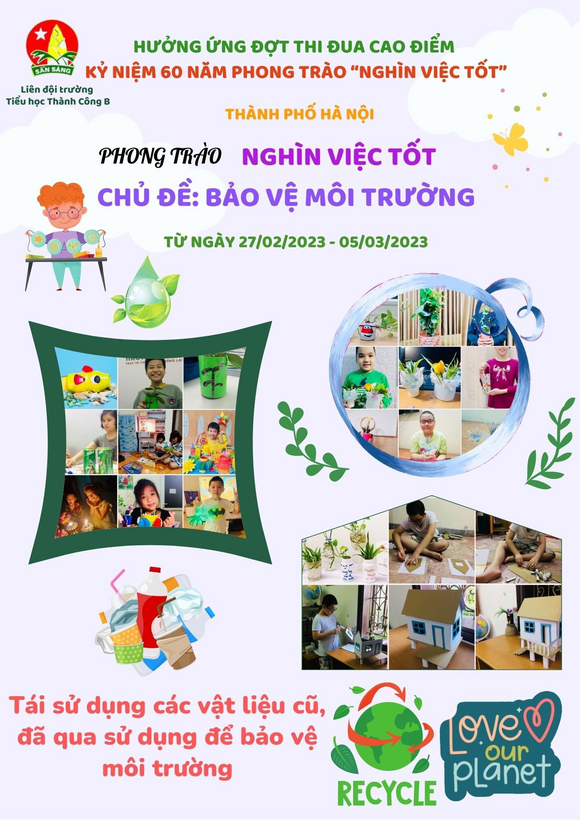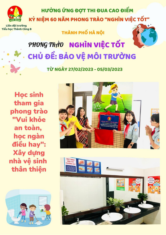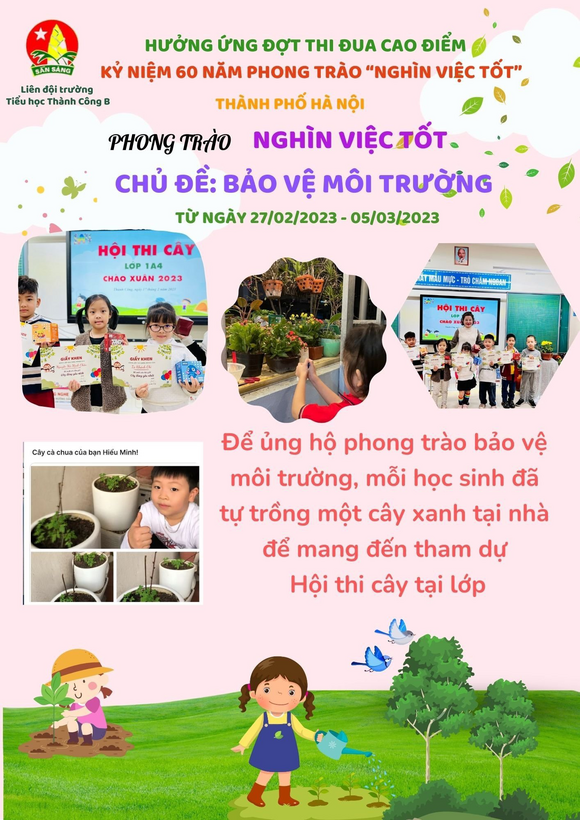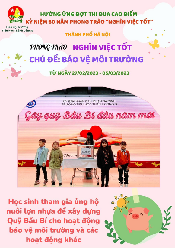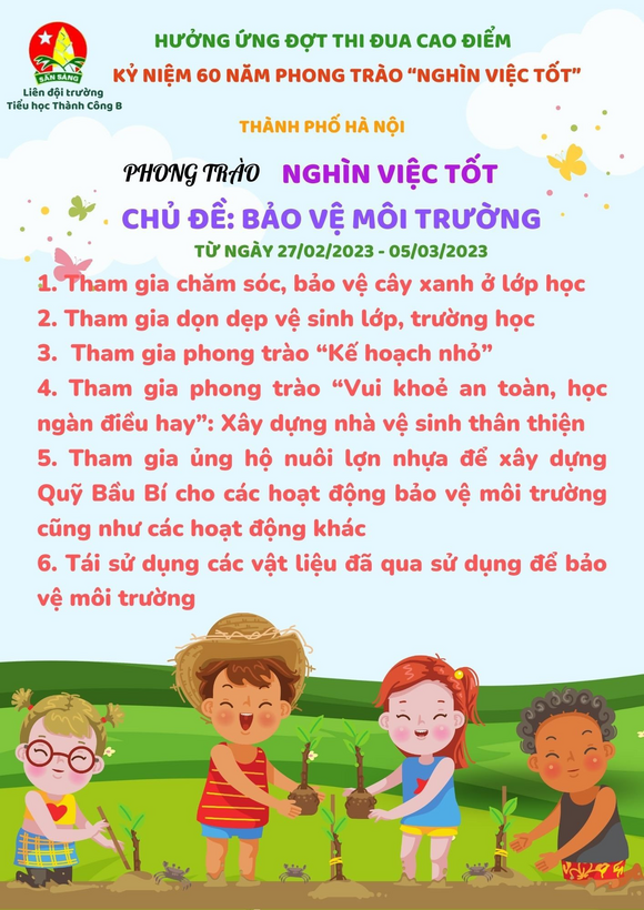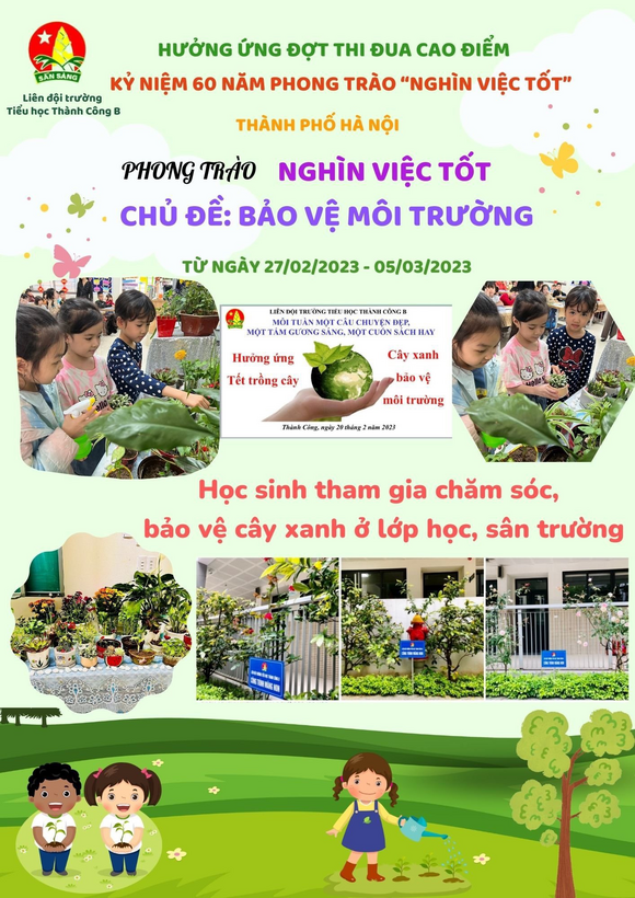 Tiếp tục tuần thi đua cao điểm chào mừng kỉ niệm 60 năm phong trào "Nghìn việc tốt" với chủ đề "Bảo vệ môi trường". Học sinh trường Tiểu học Thành Công B đã có nhiều hoạt động để chung tay bảo vệ môi trường sống như: mỗi học sinh tự trồng một cây xanh để tham gia Hội thi cây tại lớp. Tham gia lau, dọn vệ sinh lớp học. Tham gia thu gom giấy loại đã qua sử dụng để làm kế hoạch nhỏ. Chung tay cùng các thầy cô giáo xây dựng thành công mô hình "Nhà vệ sinh thân thiện". Nuôi lợn nhựa Ủng hộ "Quỹ Bầu bí" để đóng góp cho hoạt động bảo vệ môi trường và các hoạt động khác. Tổ chức các hoạt động sáng tạo sản phẩm học tập từ các vật liệu đã qua sử dụng để bảo vệ môi trường sống. Tuần thi đua sôi nổi đã nâng cao hơn ý thức của mỗi học sinh trong việc bảo vệ môi trường và trở thành hoạt động thường niên của mỗi học sinh khi tới lớp.