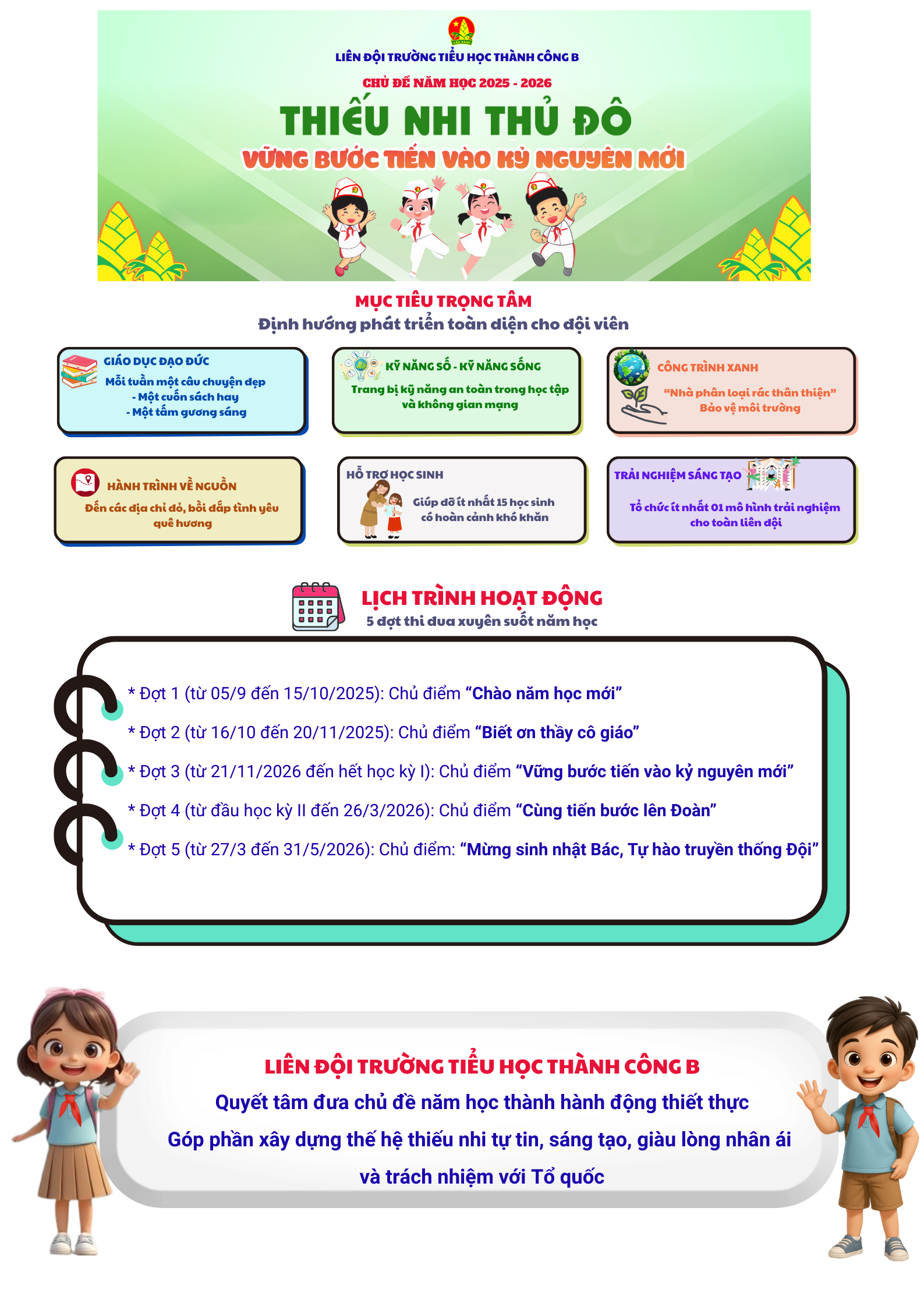Liên đội Thành Công B sẽ bám sát định hướng của Hội đồng Đội Thành phố với các nhiệm vụ cụ thể: