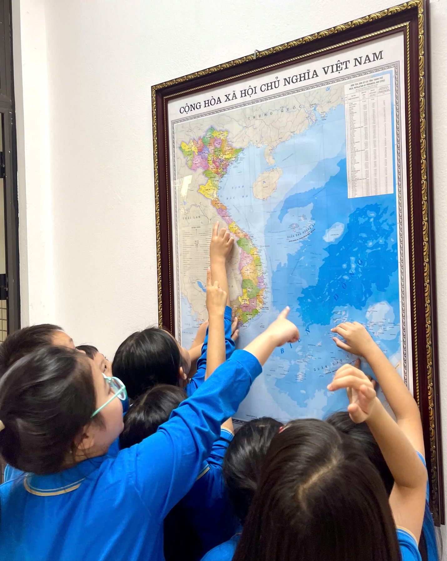 Các con học sinh rất hào hứng và tự hào khi quan sát bản đồ Việt Nam, mỗi lần nhìn vào bản đồ, các con không chỉ thấy được hình dáng đất nước mà còn cảm nhận được tình yêu và niềm tự hào sâu sắc đối với từng tấc đất, từng vùng biển, vùng đảo của Tổ quốc. Đặc biệt, với những bạn còn nhỏ, việc nhìn thấy bản đồ Việt Nam không chỉ là một hình ảnh mà còn là một nguồn cảm hứng mạnh mẽ về lòng yêu nước và ý thức bảo vệ chủ quyền đất nước.