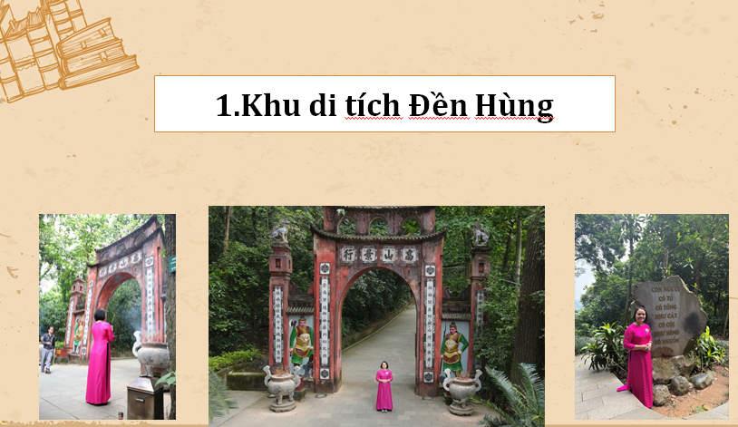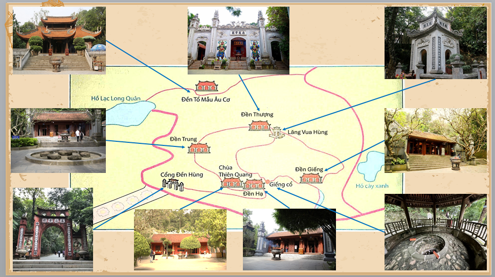 - Đền Thượng: Là nơi Vua Hùng tế trời trên đỉnh núi Nghĩa Lĩnh. Đặc biệt, các em còn biết về cột đá thề của Thục Phán (An Dương Vương), thể hiện lời thề bảo vệ đất nước mà các Vua Hùng đã trao lại , hun đúc đạo lý "Uống nước nhớ nguồn".