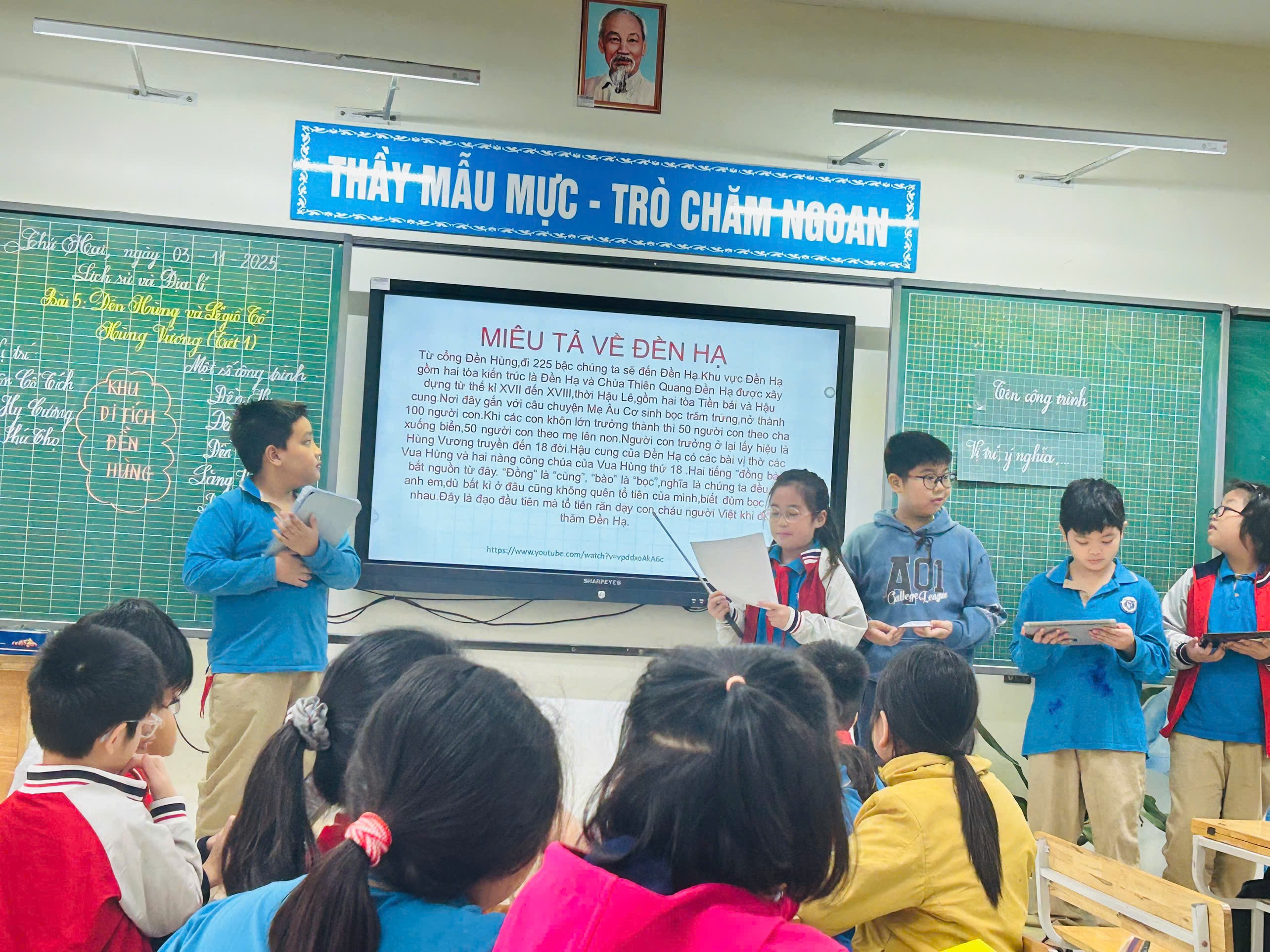 Điểm nhấn của tiết học là hoạt động nhóm, nơi các em học sinh được giao nhiệm vụ tìm hiểu chi tiết về năm công trình kiến trúc chính trong Khu di tích. Với sự hỗ trợ của video thực tế do cô giáo và gia đình quay tại Đền Hùng, cùng thiết bị điện tử để tra cứu thông tin, các nhóm đã có phần thuyết trình sáng tạo, hấp dẫn về: