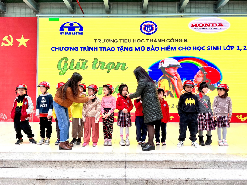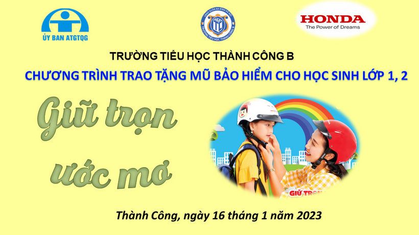 Sáng ngày 16/01 Trường Tiểu học Thành Công B đã tổ chức trao quà của công ty Honda Việt Nam cho học sinh lớp 1, lớp 2 trong trường. Các em rất vui khi nhận được sự quan tâm của thầy cô và của toàn xã hội. Những chiếc mũ bảo hiểm xinh xinh mang thông điệp giữ trọn mơ ước như muốn gửi gắm tình yêu thương của toàn xã hội dành cho các em.