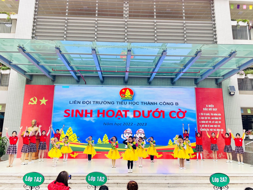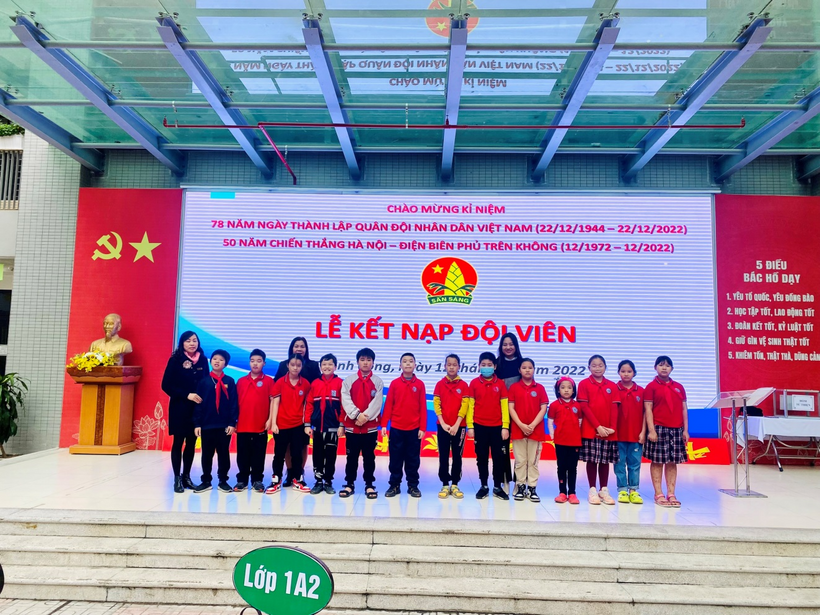 Đầu tiên là Lễ kết nạp Đội viên cho 82 nhi đồng chăm ngoan, có thành tích học tập tốt, tích cực tham gia các phong trào, hoạt động của nhà trường. học sinh khối 4 – 5.