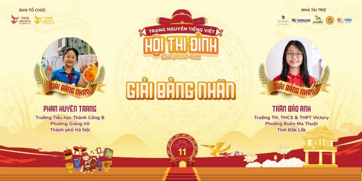 Vượt qua hơn 6 triệu thí sinh, Huyền Trang cùng 328 sĩ tử xuất sắc hội tụ tại Hà Nội dự Hội thi Đình Trạng Nguyên Tiếng Việt 2025-2026 vào chiều 11/4/2026. Tại đây, các sĩ tử thực hiện bài thi tự luận và trực tuyến, đòi hỏi kiến thức sâu rộng cùng tư duy sáng tạo, trong đó Trang đã hoàn thành xuất sắc cả hai phần thi. Sáng 12/4/2026, giữa không gian cổ kính của Văn Miếu, con đã chính thức được xướng tên và nhận giải thưởng Bảng Nhãn.