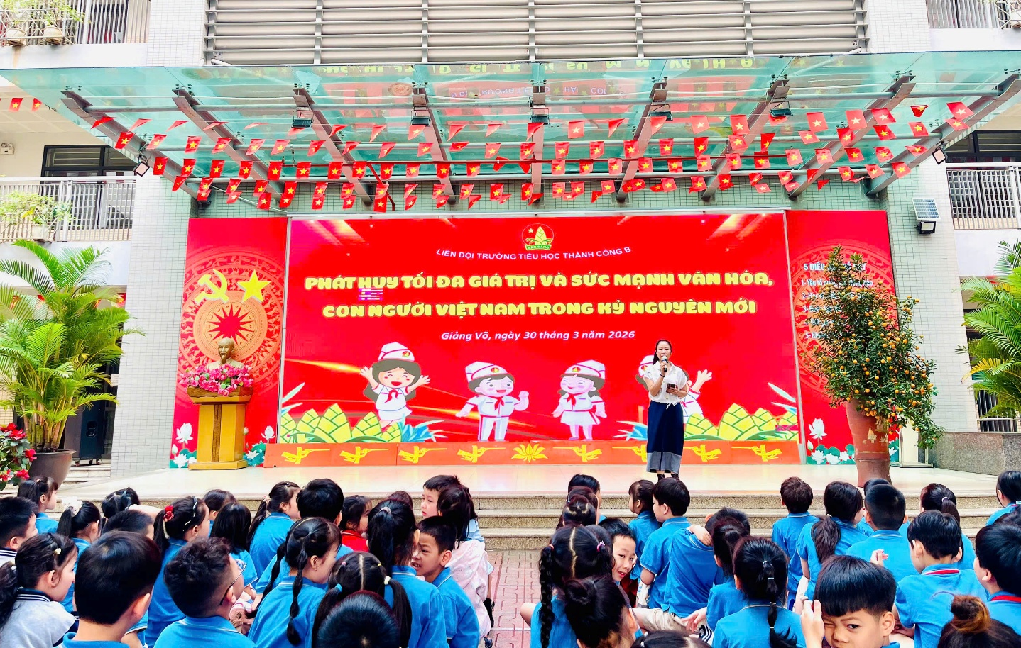 Sáng thứ Hai, ngày 30/3, trong không khí trang nghiêm và đầy cảm hứng, Trường Tiểu học Thành Công B đã tổ chức buổi sinh hoạt dưới cờ đầu tuần với chủ đề: “Phát huy tối đa giá trị và sức mạnh văn hóa, con người Việt Nam trong kỷ nguyên mới”. Chương trình do cô Đào Thị Thái – Tổng phụ trách Đội trực tiếp tổ chức và điều hành, với sự tham gia của toàn thể cán bộ, giáo viên và học sinh nhà trường.