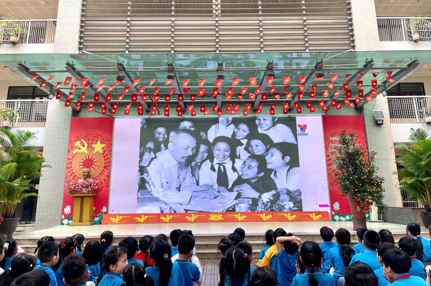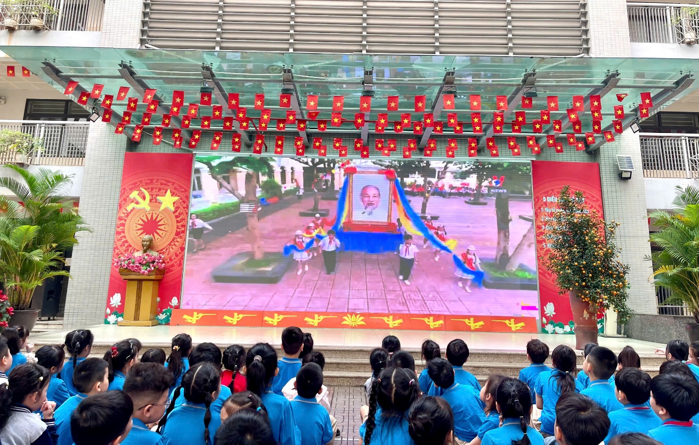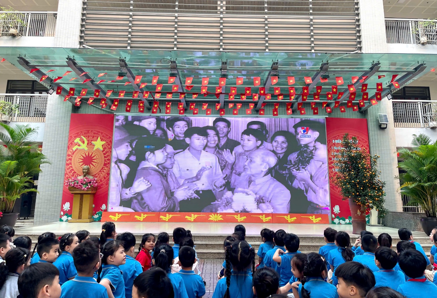 Không chỉ dừng lại ở biểu diễn, chương trình còn đưa học sinh trở về với những thước phim tư liệu lịch sử ý nghĩa. Qua màn hình lớn, các em được chứng kiến những khoảnh khắc hào hùng của dân tộc, những hình ảnh giản dị nhưng xúc động về Bác Hồ kính yêu cùng nhân dân. Đây chính là cách giáo dục trực quan, giúp các em hiểu sâu sắc hơn về truyền thống, từ đó bồi đắp lòng biết ơn và niềm tự hào dân tộc.