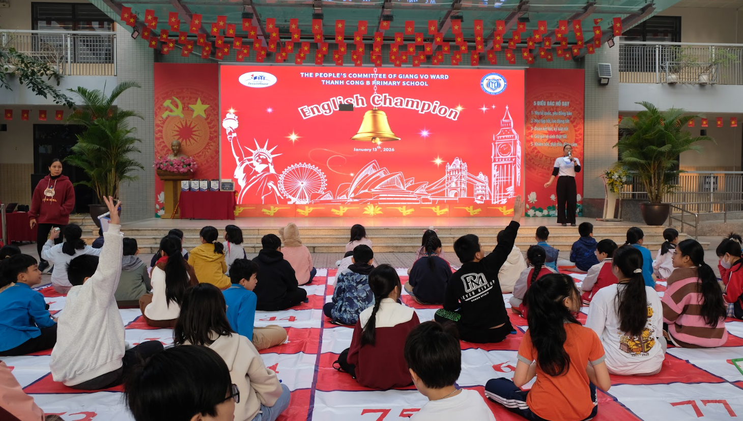 Mỗi khoảnh khắc trên sàn thi đấu là một cung bậc cảm xúc đáng nhớ: hồi hộp chờ đáp án, vỡ òa khi trả lời chính xác và những tràng pháo tay cổ vũ nồng nhiệt dành cho các thí sinh kiên trì bám trụ đến phút cuối. Qua đó có thể thấy rõ sự tiến bộ về năng lực ngôn ngữ, tư duy logic và sự tự tin của học sinh Tiểu học Thành Công B trong quá trình tiếp cận Tiếng Anh một cách tự nhiên, chủ động.