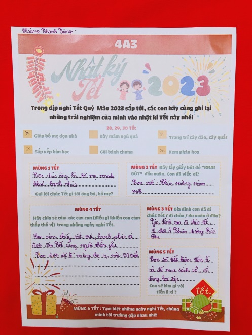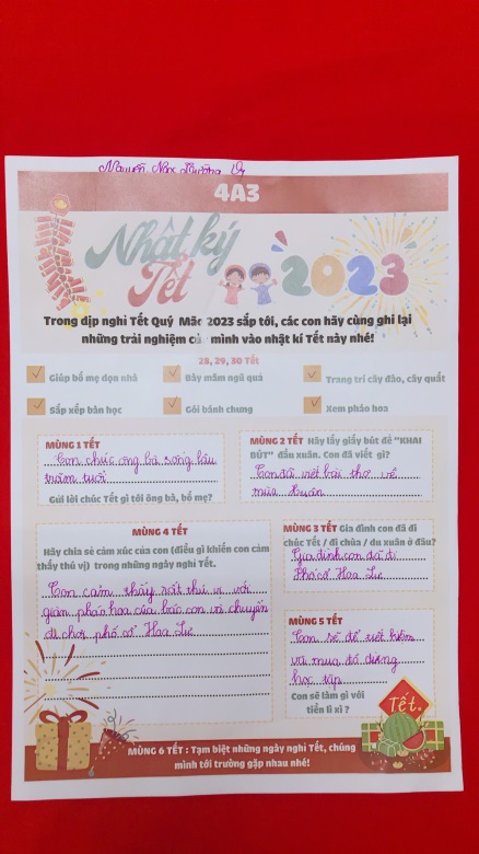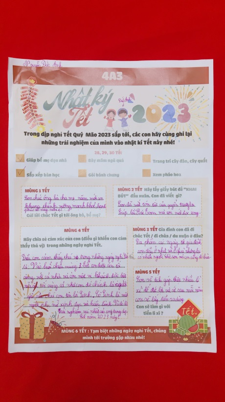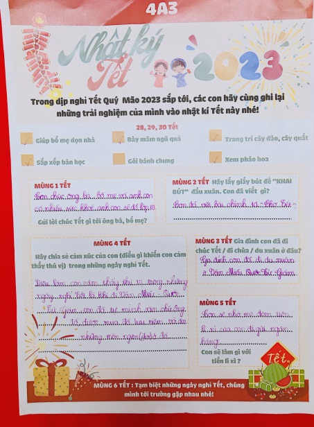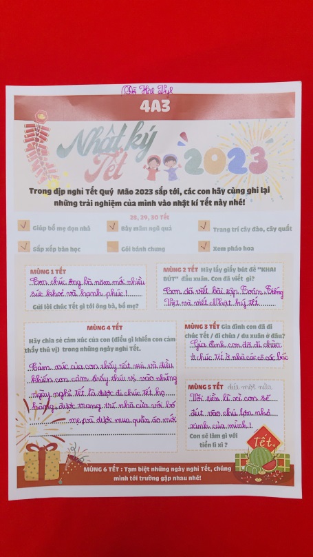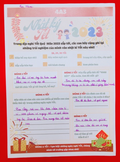 Vì học tới hết ngày 27 Tết nên chúng tớ ghi lại nhật kí từ ngày 28,29,30 Tết. Những ngày ấy, tết “rón rén” gõ cửa từng nhà bằng những sắc màu lộng lẫy trên đường phố, những bản nhạc xuân vang lên rộn ràng. Nghỉ ở nhà nên cô đã list ra một số đầu công việc để chúng tớ có thể dễ dàng xác định ngay những việc nên làm và cần phải làm như: Giúp bố mẹ dọn nhà, sắp xếp bàn học, bày mâm ngũ quả, gói bánh chưng, trang trí cây đào cây quất, xem pháo hoa,…Làm được việc nào là tích liền vào việc đó, sau Tết tha hồ đọ với tụi bạn ở lớp!
