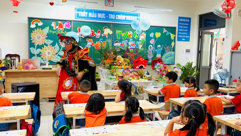 Trong cái tiết trời nhẹ nhàng, trong veo, ấm nồng hương cốm, Trung thu của các bạn nhỏ lớp 1A4 lại càng đẹp hơn dưới bàn tay khéo léo của các bà mẹ lớp 1A4 cùng cô giáo hào hứng chuẩn bị mâm cỗ Trung thu cho các con.