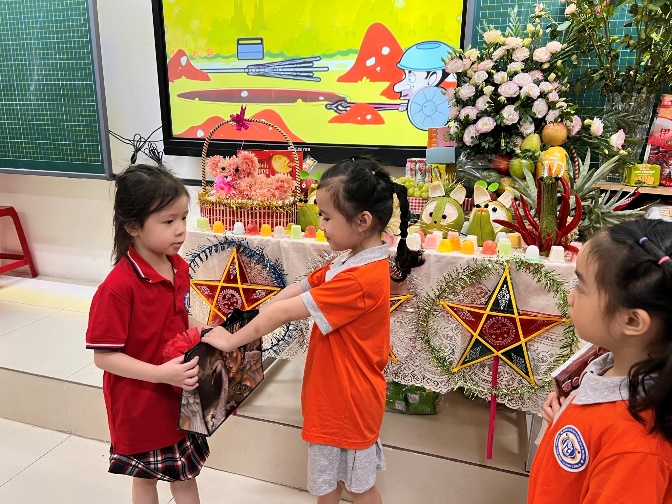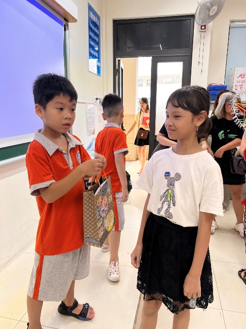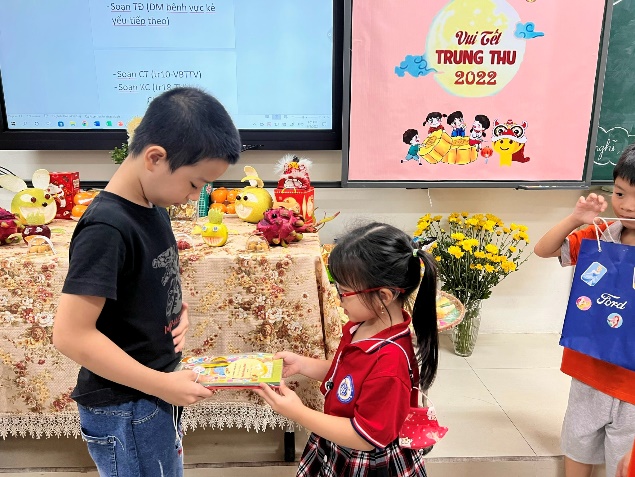Sau khi trang trí xong túi quà, các bạn được cô giáo chủ nhiệm và dẫn đi từng lớp để gặp những anh chị, những bạn có hoàn cảnh khó khăn, trao tận tay món quà con đã chuẩn bị nhân dịp Tết Trung thu. Lời chúc giản đơn các bạn dành cho nhau đó là: “Em có món quà tặng anh, chị dịp Tết Trung thu. Em chúc anh, chị học giỏi”.