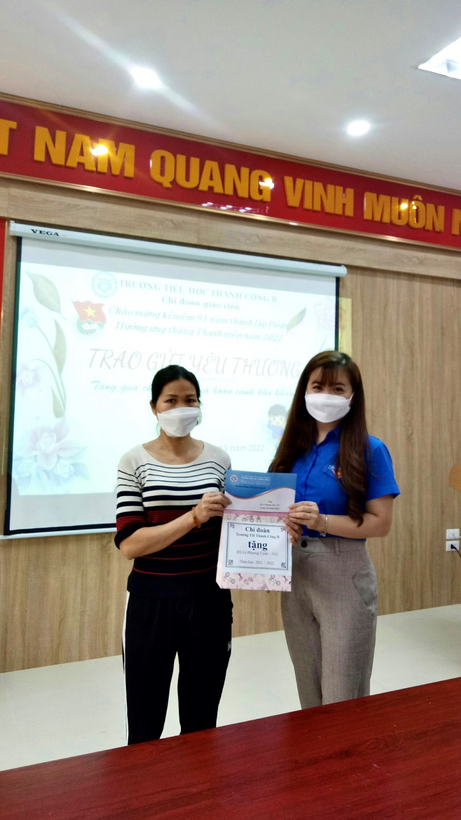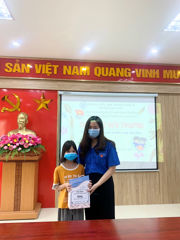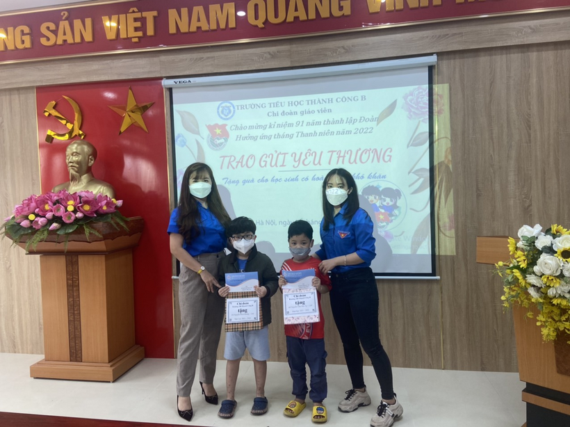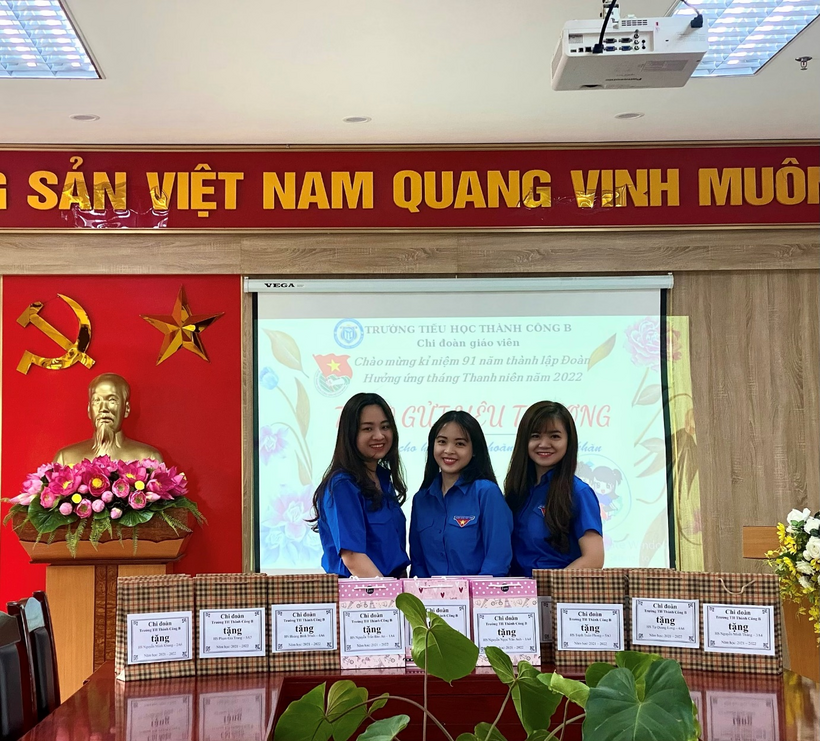 Từ lâu, Chi đoàn giáo viên trường Tiểu học Thành Công B đã làm tốt công tác khuyến học, nhân đạo, từ thiện trong và ngoài nhà trường. Nhân kỉ niệm 91 năm thành lập Đoàn và hưởng ứng tháng Thanh niên, Chi đoàn đã chuẩn bị và trao tặng những phần quà thiết thực dành cho các con học sinh có hoàn cành khó khăn trong nhà trường, giá trị mỗi suất quà là 375.000 đồng.