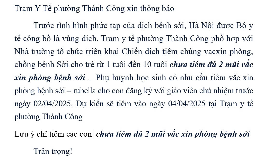 Trước tình hình phức tạp của dịch bệnh sởi, Hà Nội được Bộ y tế công bố là vùng dịch, Trạm y tế phường Thành Công phố hợp với Nhà trường tổ chức triển khai Chiến dịch tiêm chủng vacxin phòng, chống bệnh Sởi cho trẻ từ 1 tuổi đến 10 tuổi chưa tiêm đủ 2 mũi vắc xin phòng bệnh sởi. Phụ huynh học sinh có nhu cầu tiêm vắc xin phòng bệnh sởi – rubella cho con đăng ký với giáo viên chủ nhiệm trước ngày 02/04/2025. Dự kiến sẽ tiêm vào ngày 04/04/2025 tại Trạm y tế phường Thành Công. Lưu ý chỉ tiêm các con chưa tiêm đủ 2 mũi vắc xin phòng bệnh sởi. Trân trọng!