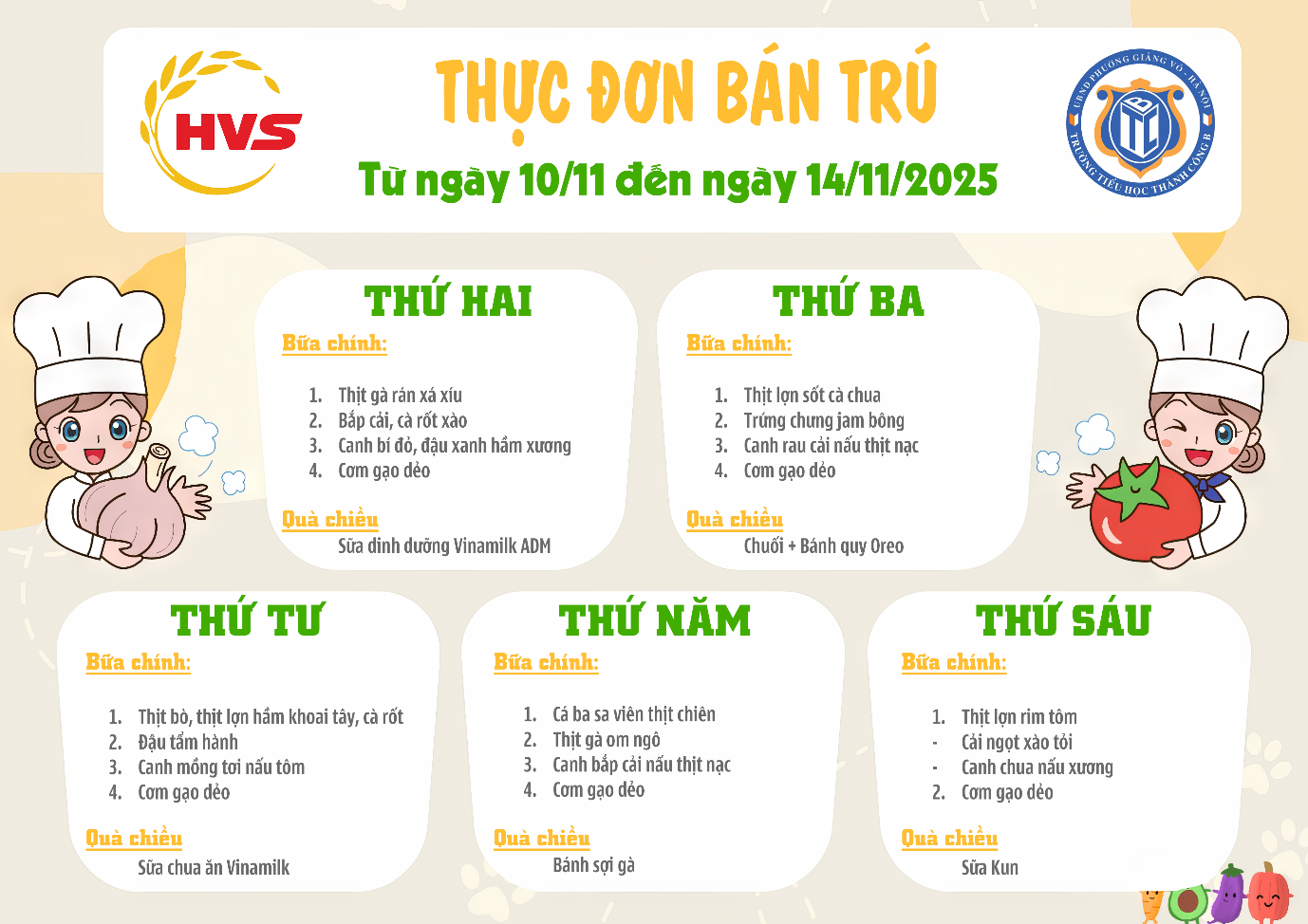 Thực đơn bán trú từ ngày 10/11 đến ngày 14/11